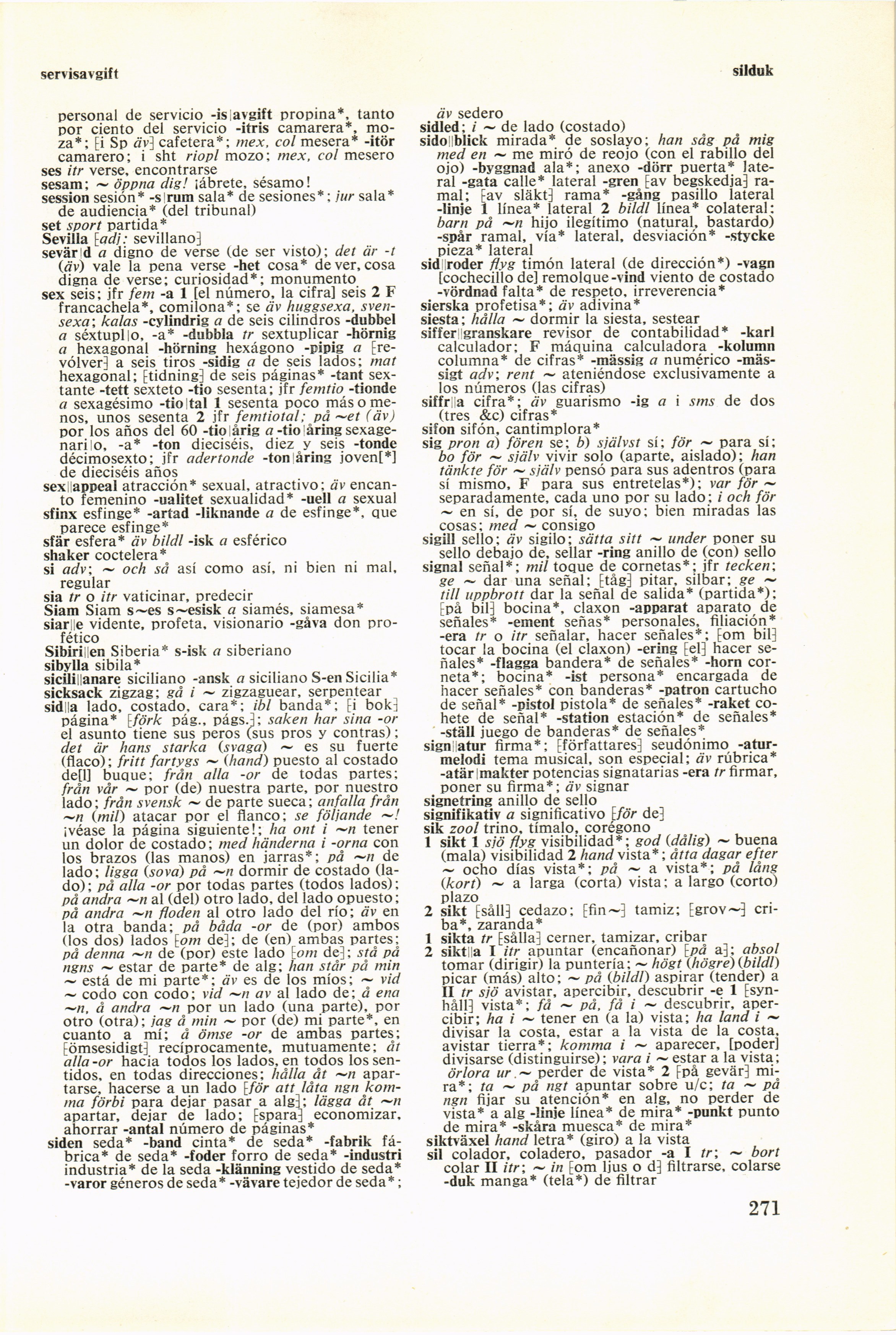sig pron a) för en se; b) själv st sí; för ~ para sí;