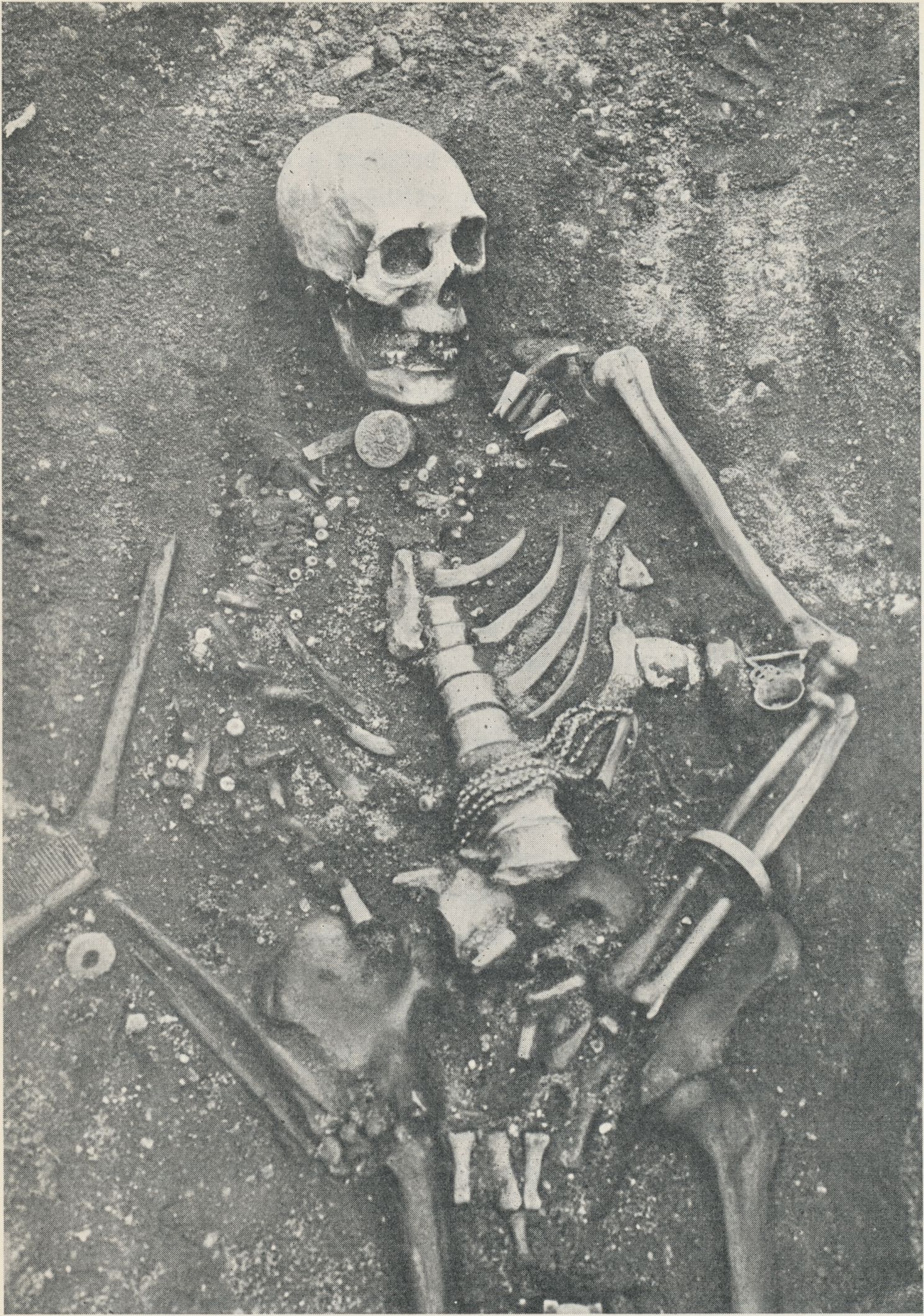 | Kvinnograv från vikingatiden, upptäckt vid Hallvede, Eke socken på Gotland, under utgrävning. Efter M. Stenberger. |
