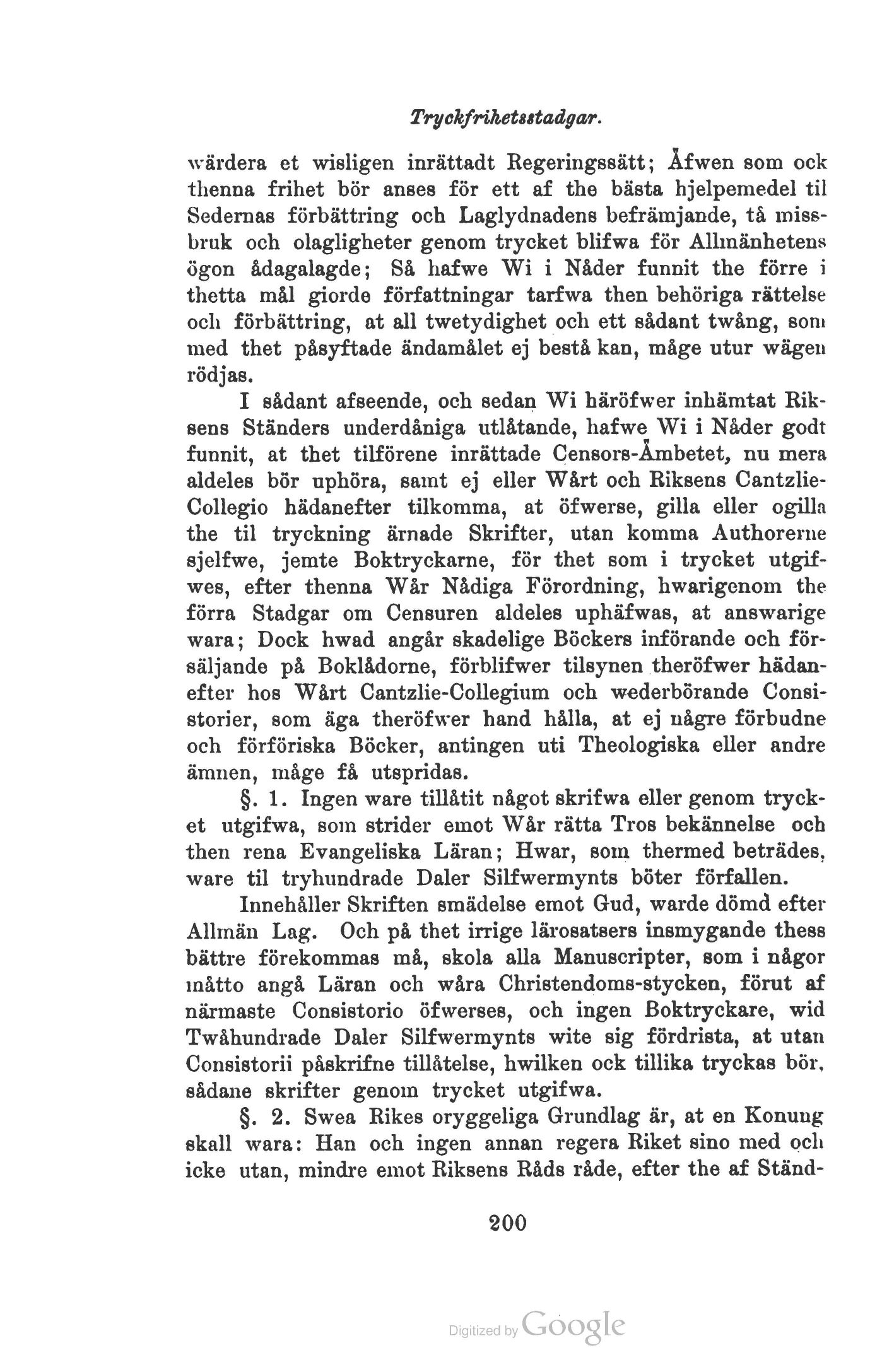 §. 1. Ingen ware tillåtit något skrifwa eller genom