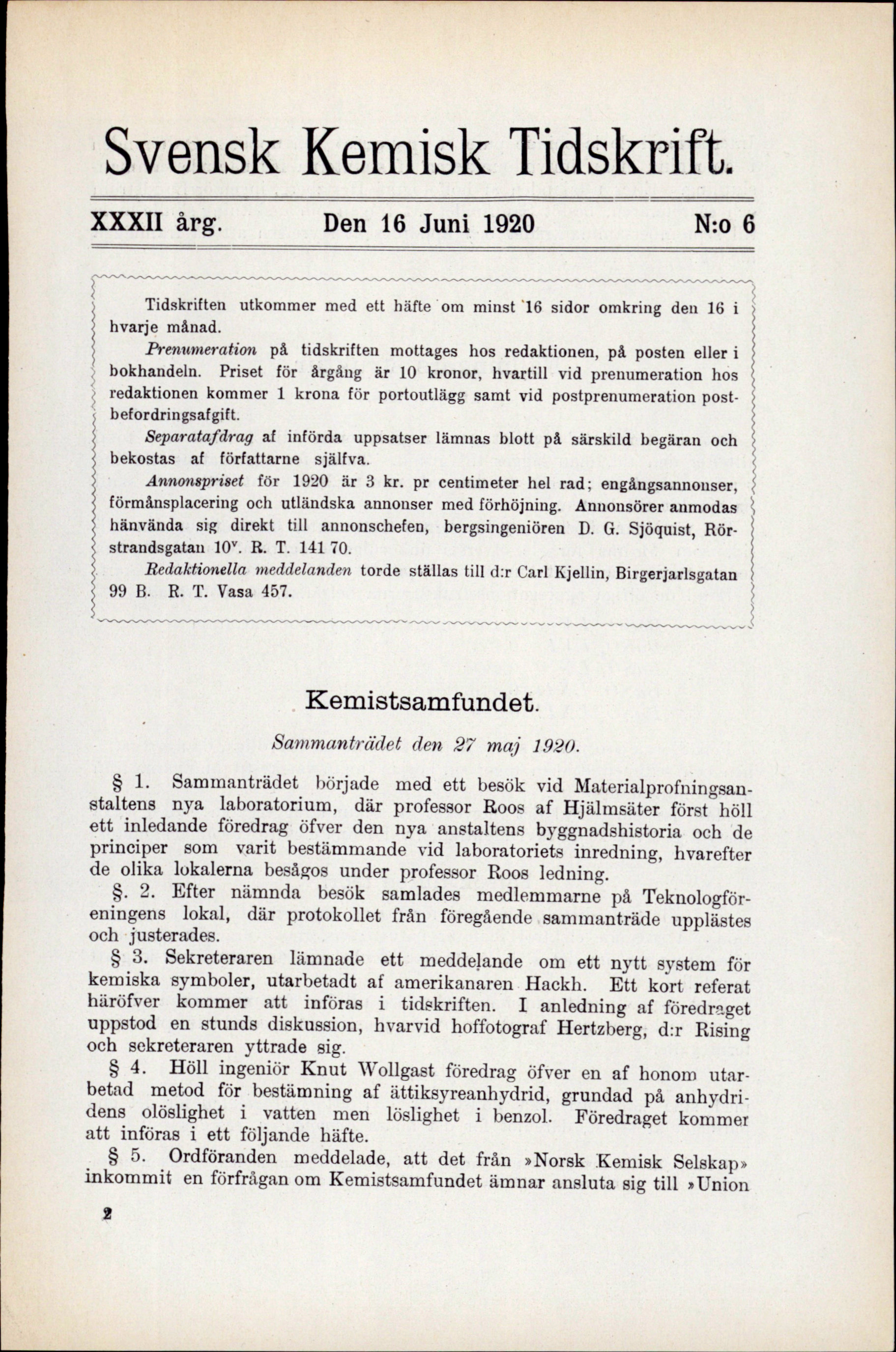 Full resolution (JPEG) - On this page / på denna sida - N:o 6. 16 Juni 1920 - Kemistsamfundet