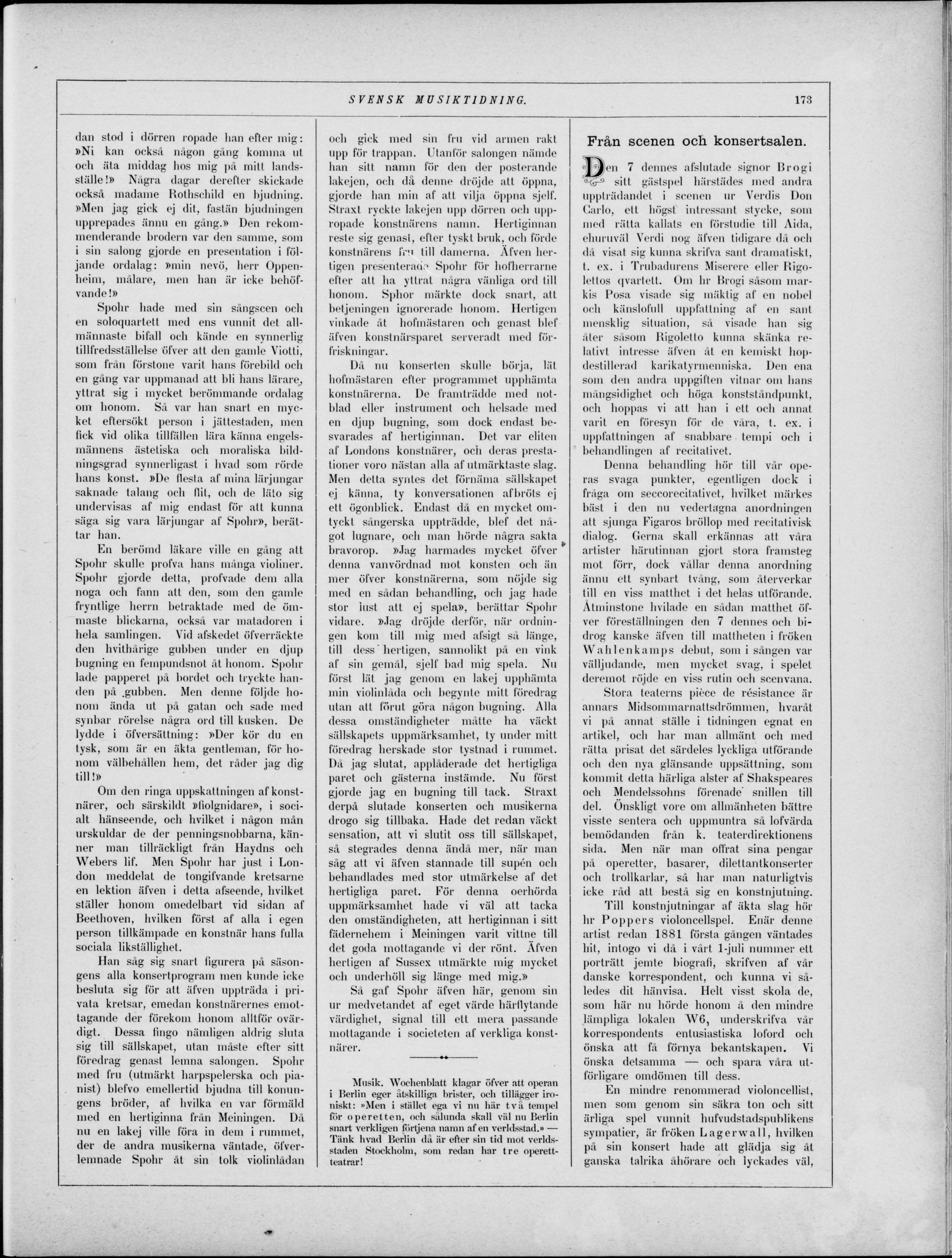 konstnärer. Musik. Wochenblatt klagar öfver att operan i Berlin eger åtskilliga brister, och tillägger