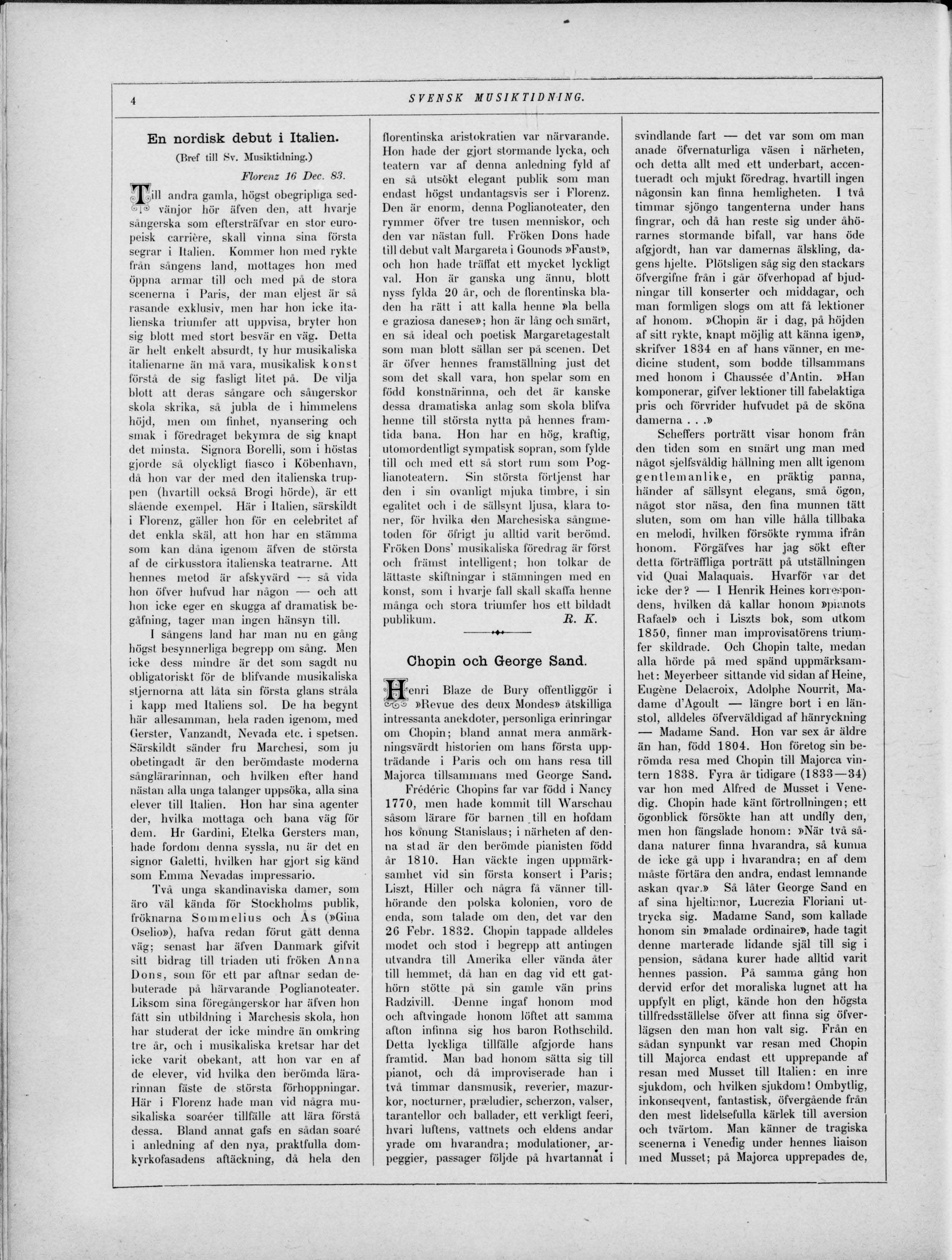 sängmetoden för öfrigt ju alltid varit berömd. Fröken Dons’ musikaliska föredrag är först och främst intelligent; hon tolkar de lättaste skiftningar i stämningen med en konst, som i hvarje fall skall skaflä henne inånga och stora triumfer hos ett bildadt publikum. R. K. Chopin och George Sand. genri Blaze de Bury offentliggör i s1 »Revue des deux Mondes» åtskilliga intressanta anekdoter, personliga erinringar om Chopin; bland annat mera