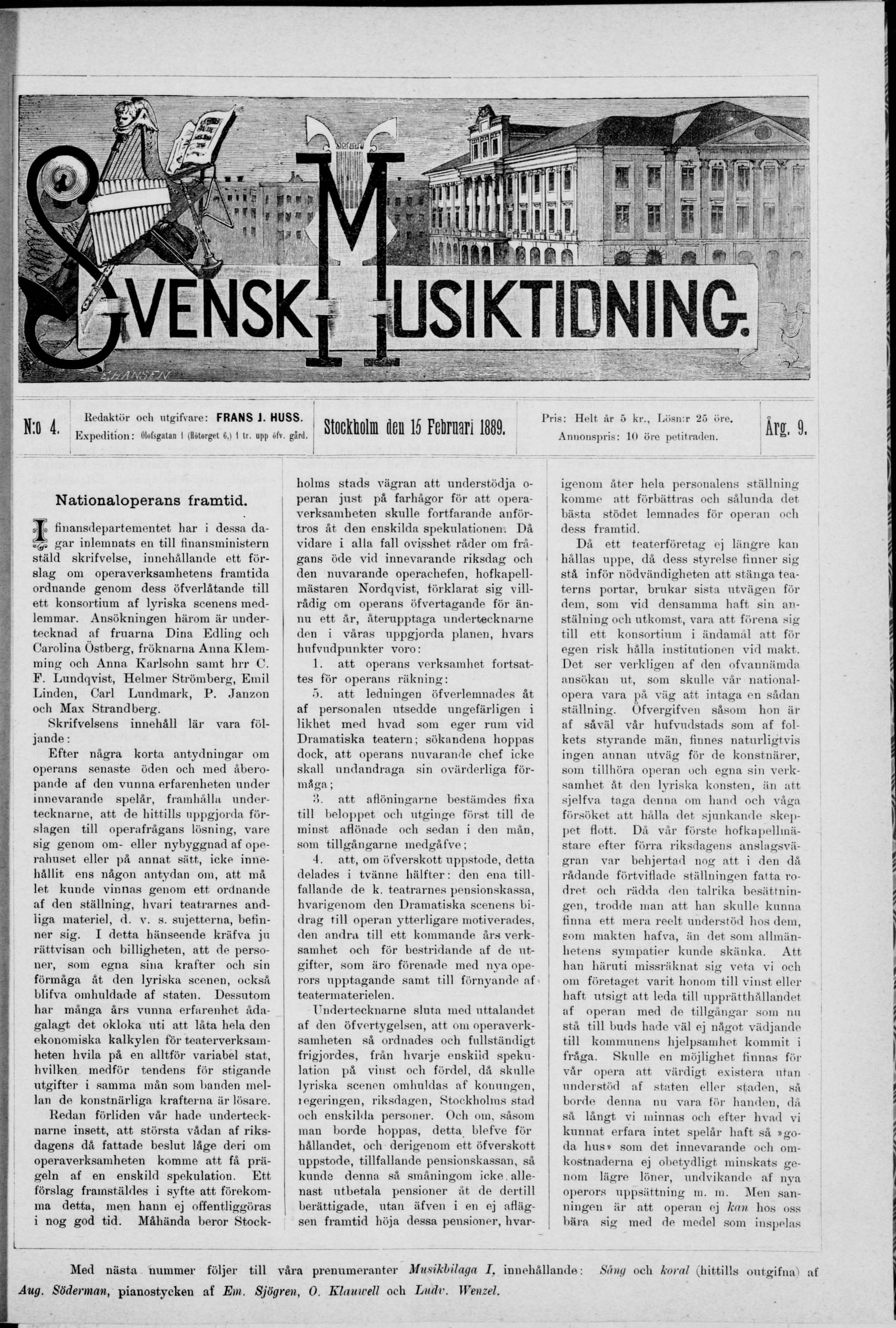 N:o 4. Redaktör och ntgifvare: FRANS J. HUSS. Expedition: Olofsgatan 1 (Hötorget 6,) 1 tr. upp öfv. gård. 1 1 J Stockholm öeu 15 Februari 1889. Pris: Holt år 5 kr., Lösn:r 25 öre. Anuonspris: 10 öre petitraden.