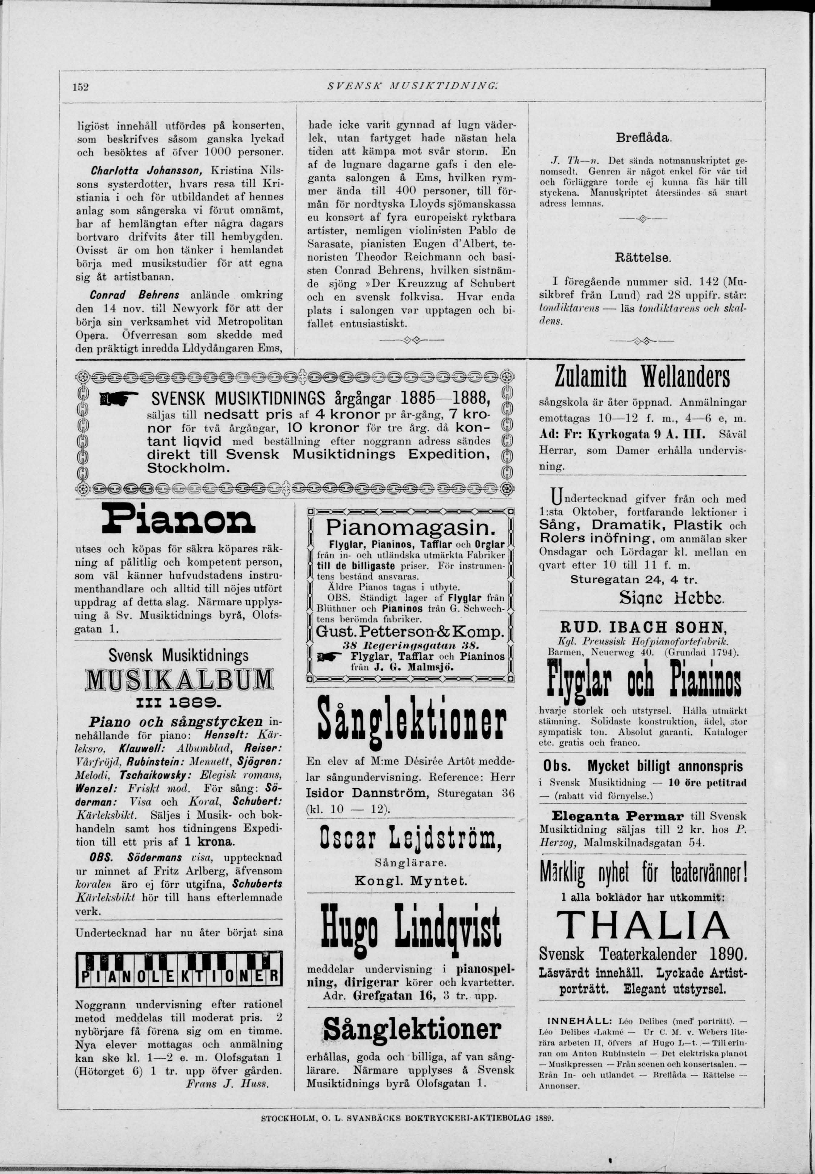 SVENSK MUSIKTIDNINGS årgångar 1885 1888,