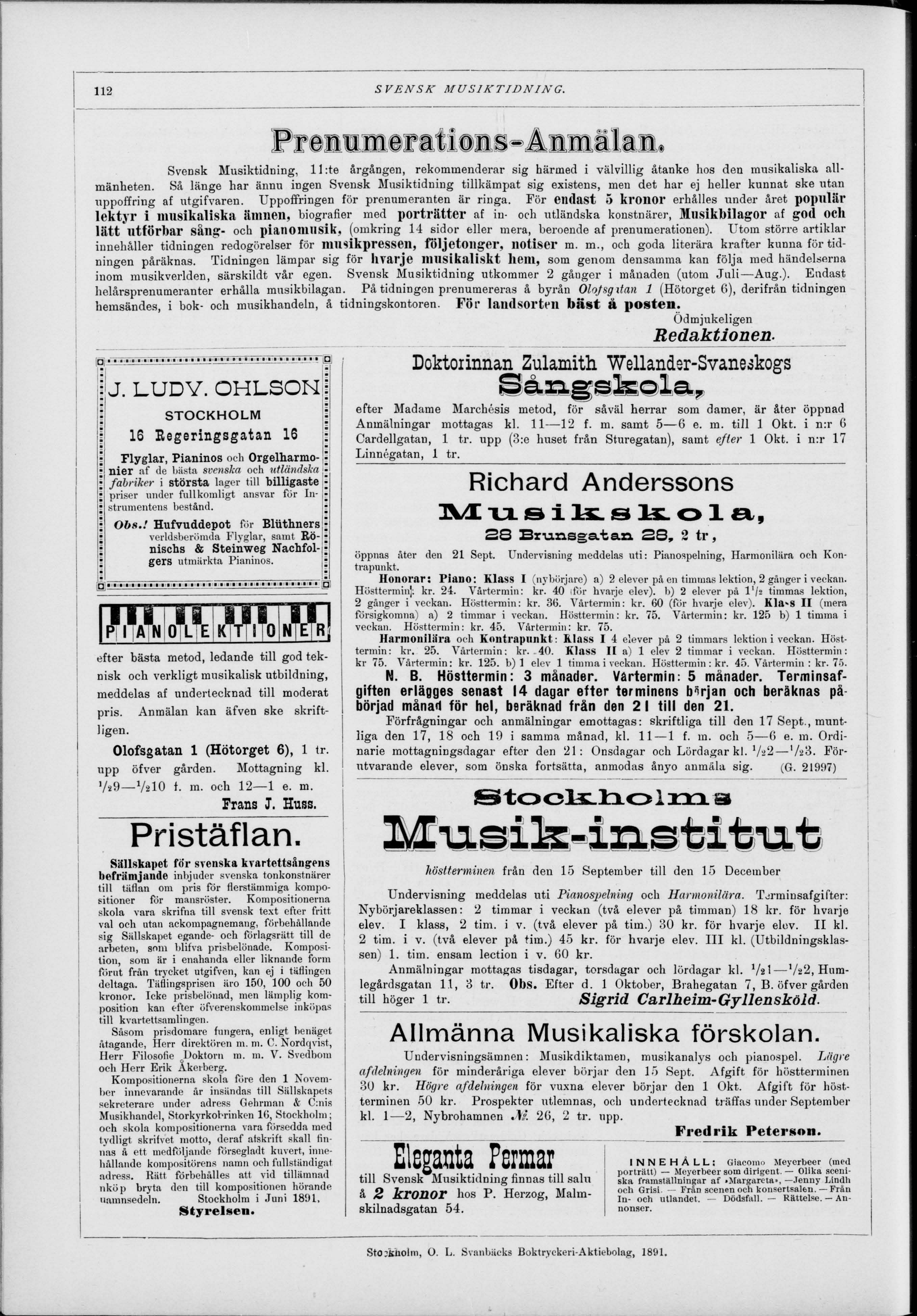 helårsprenumeranter erhålla musikbilagan. På tidningen prenumereras å byrån Olojsgitan 1 (Hötorget 6), derifrån tidningen
