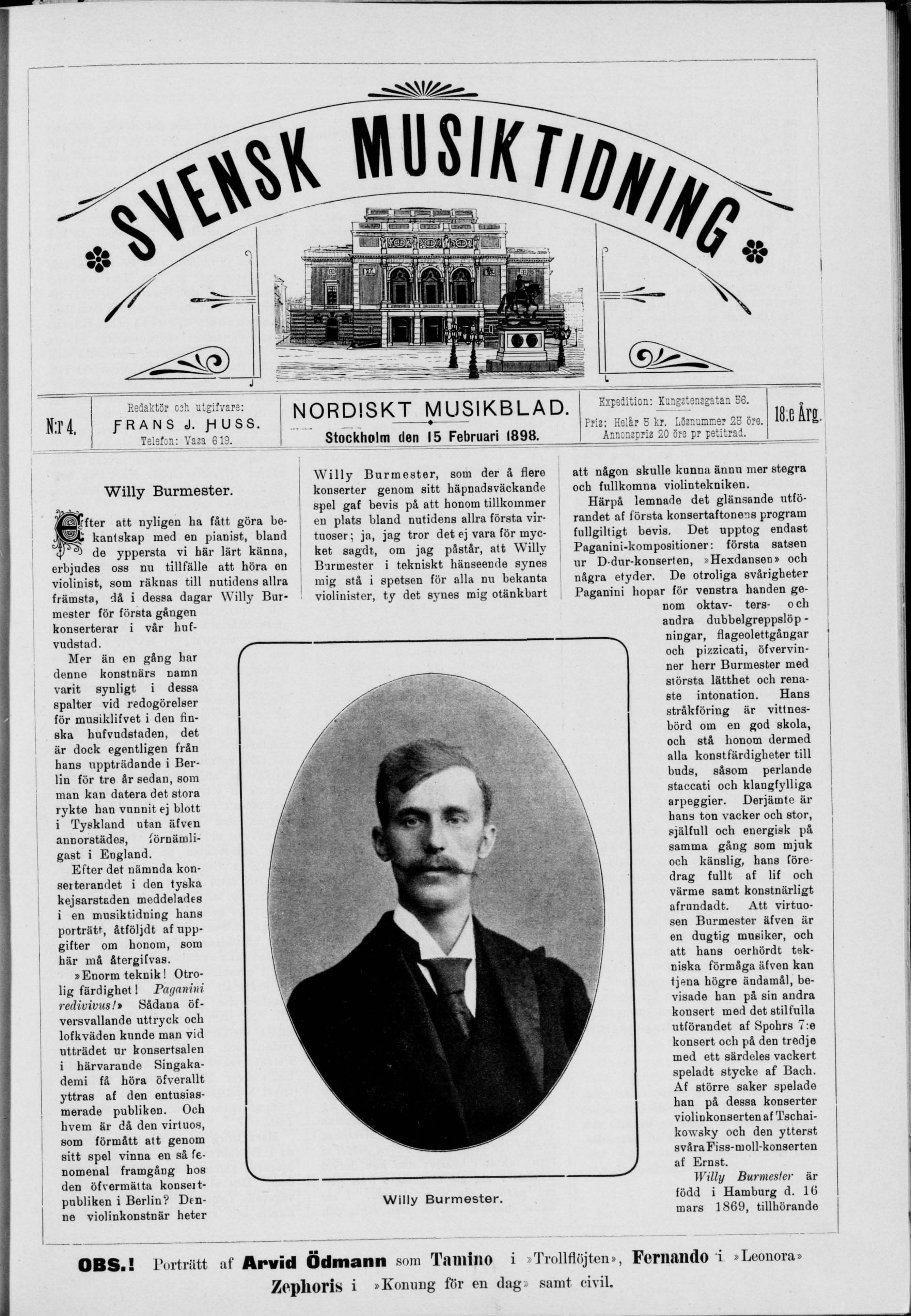 N:r 4, Redaktör csli utgifvare: f RANS J. JHUSS. Tels.’::.: 7. . 613. NORDISKT MUSIKBLAD. ♦ Stockholm den 15 Februari 1898. Expedition: Kungstensgatan 56. Pris: Helår 5 kr. Losnummer 25 öre. Annonspris 20 öre pr petitrad. 18;e åra.