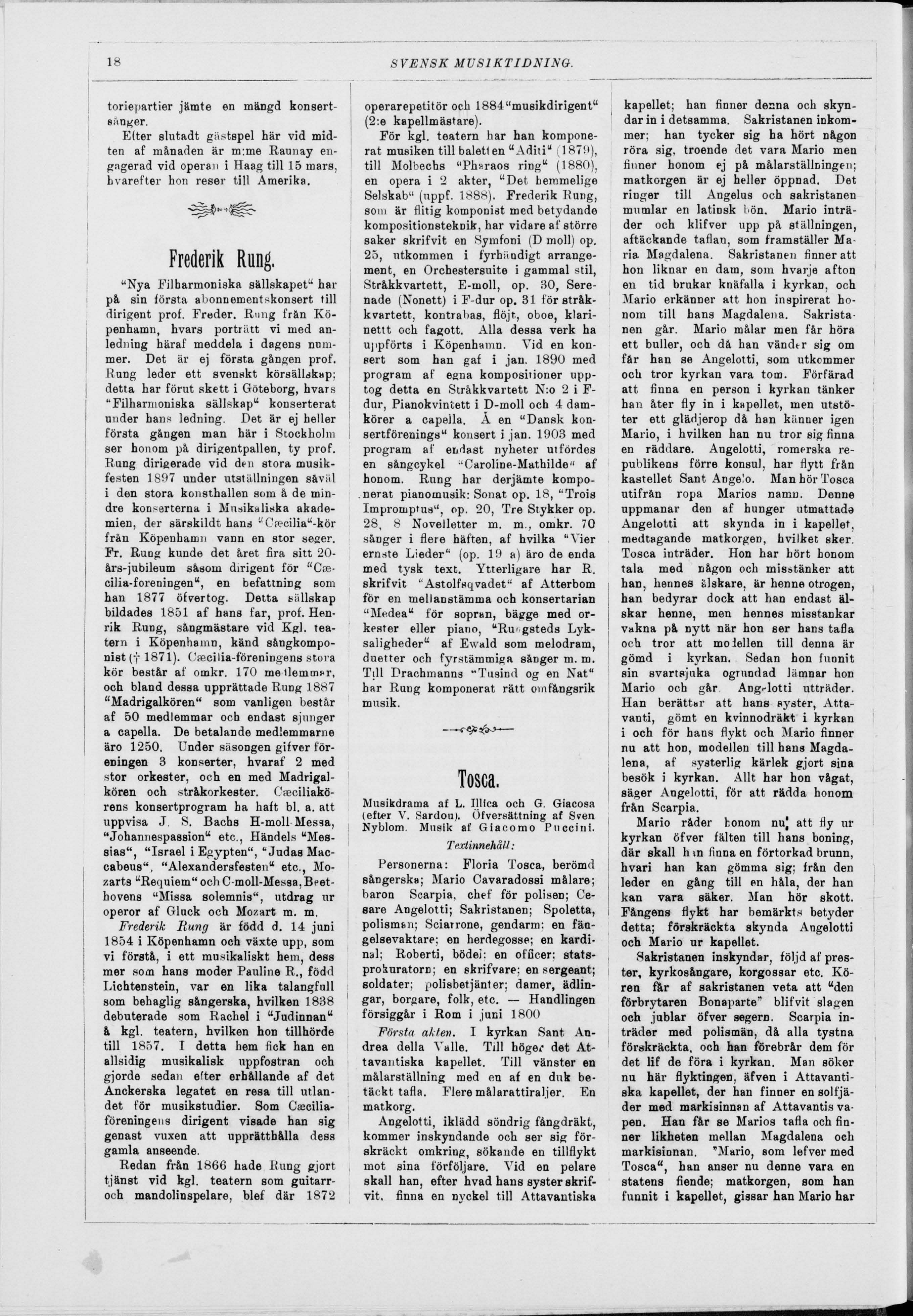 Full resolution (JPEG) - On this page / på denna sida - N:r 3. 2 Februari 1904 - Jeanne Raunay (med porträtt) - Frederik Rung (med porträtt) - Tosca, musikdrama i tre akter af L. Illica och G. Giacosa, efter V. Sardou. Öfversättning af Sven Nyblom. Musiken af Giacomo Puccini. Textinnehåll
