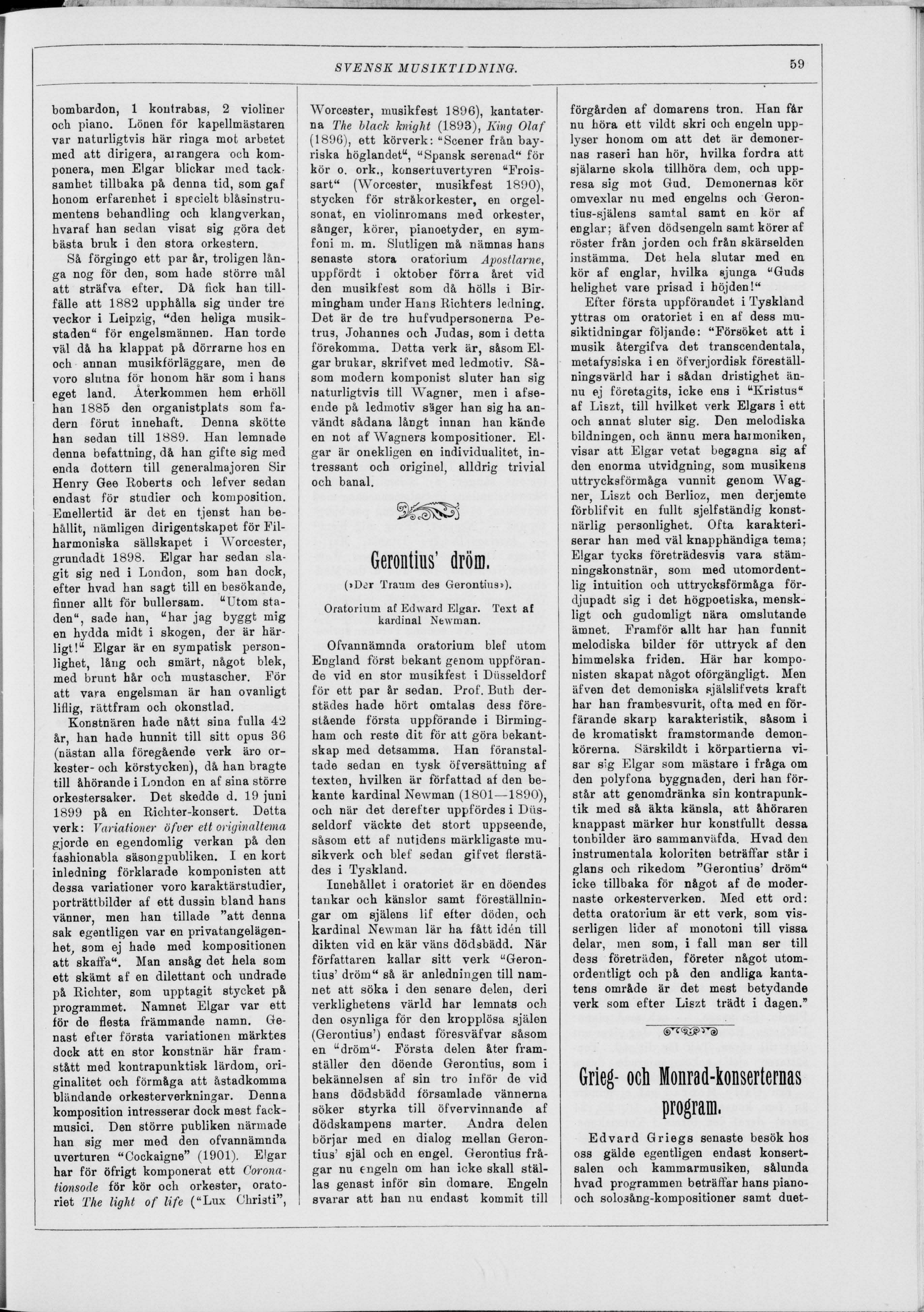 Full resolution (JPEG) - On this page / på denna sida - N:r 8. 20 April 1904 - Edward Elgar (med porträtt) - Gerontius’ dröm (»Der Traum des Gerontius»). Oratorium af Edward Elgar. Text af kardinal Newman - Grieg- och Monrad-konserternas program