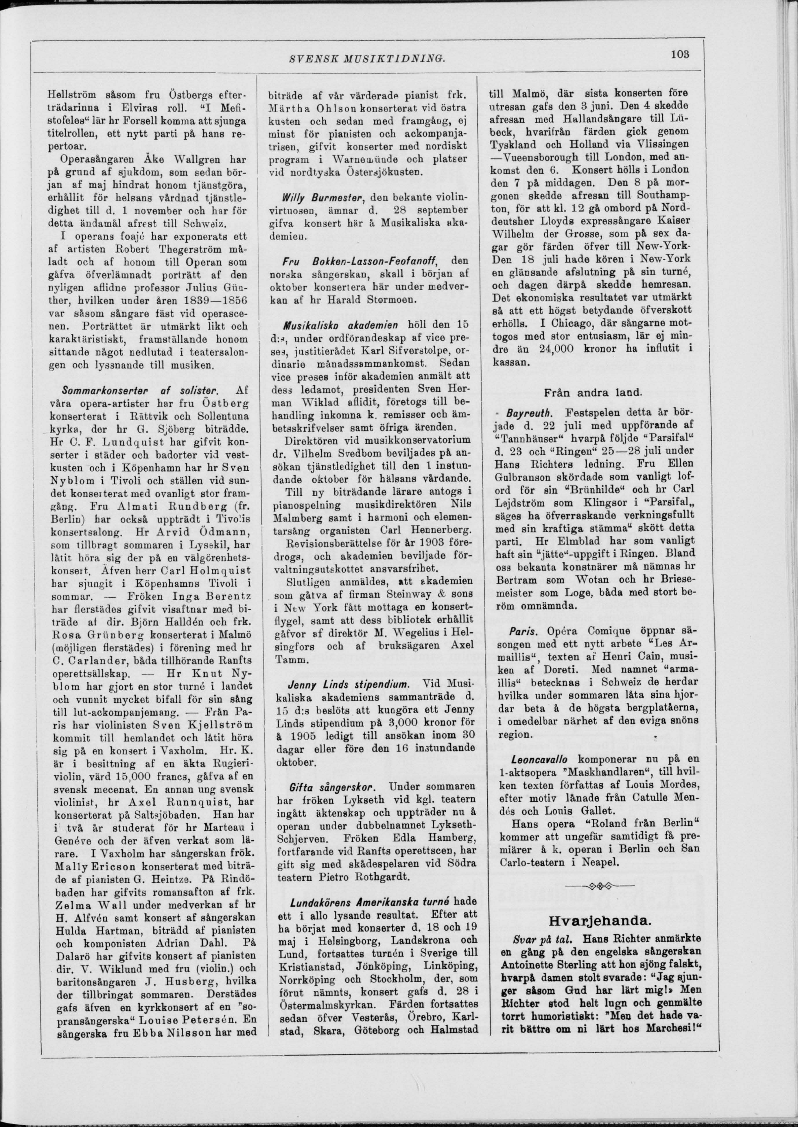 Full resolution (JPEG) - On this page / på denna sida - N:r 13. 19 September 1904 - Musiknotiser från hufvudstaden och landsorten - Kgl. Teatern - Sommarkonserter af solister - Willy Burmeister - Fru Bokken-Lasson-Feofanoff - Musikaliska akademien - Jenny Linds stipendium - Gifta sångerskor - Lundakörens Amerikanska turné - Från andra land - Bayreuth - Paris - Leoncavallo - Hvarjehanda: Svar på tal