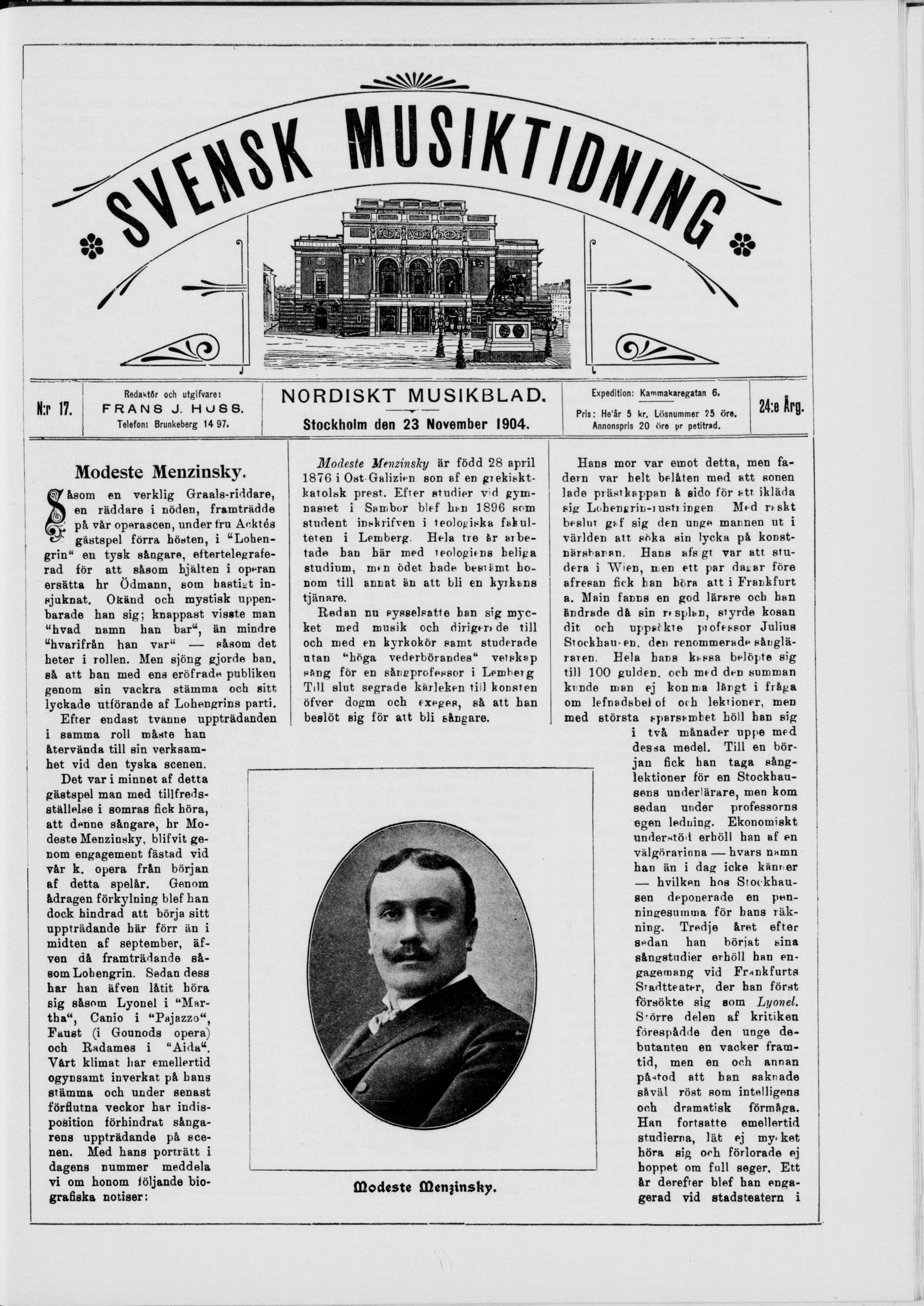 Full resolution (JPEG) - On this page / på denna sida - Titel och innehåll - N:r 17. 23 November 1904 - Modeste Menzinsky (med porträtt)