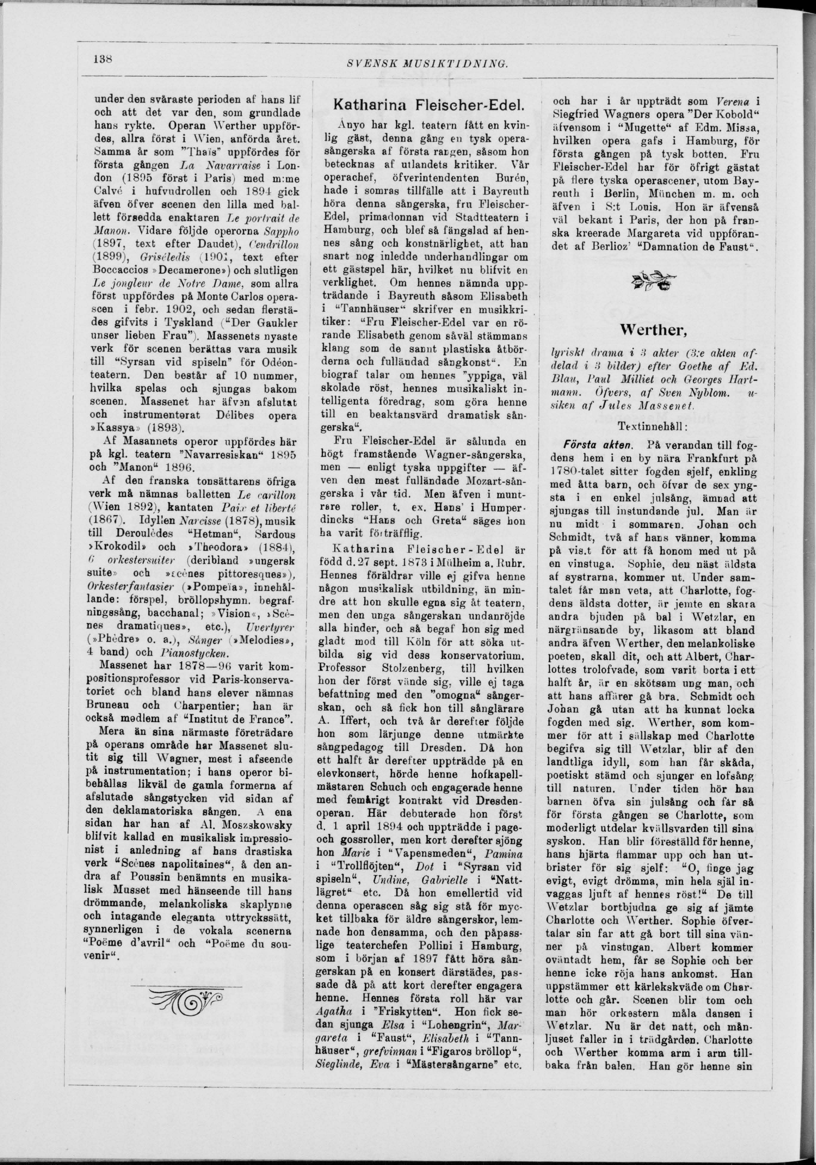 Full resolution (JPEG) - On this page / på denna sida - N:r 18. 5 December 1904 - Jules Massenet (med porträtt) - Katharina Fleischer-Edel (med porträtt) - »Werther», lyriskt drama i 3 akter, efter Goethe af Ed. Blau, Paul Milliet och Georges Hartmann. Öfvers. af Sven Nyblom. Musik af Jules Massenet. Textinnehåll