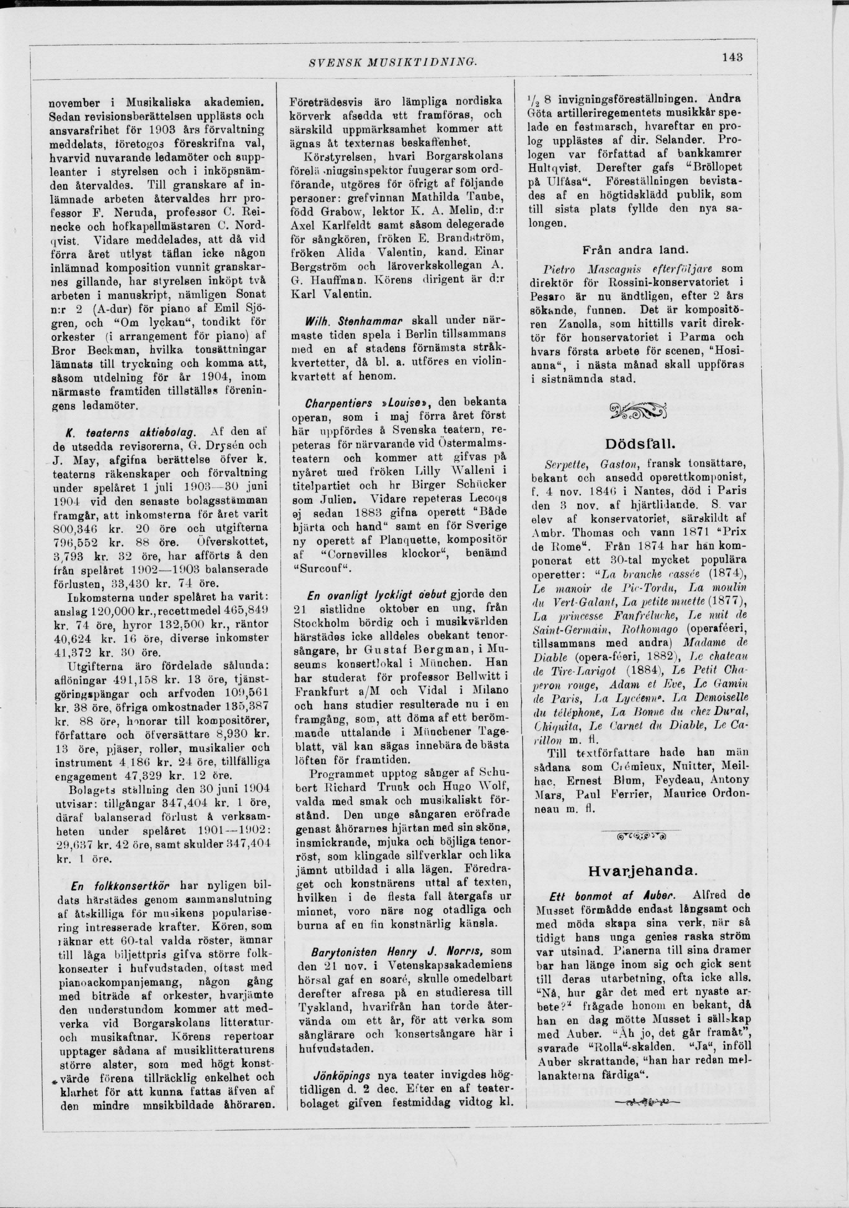 Full resolution (JPEG) - On this page / på denna sida - N:r 18. 5 December 1904 - Musikaliska konstföreningen - K. teaterns aktiebolag - En folkkonsertkör - Wilh. Stenhammar - Charpentiers »Louise» - En ovanligt lycklig debut - Barytonisten Henry J. Norris - Jönköping - Från andra land - Pietro Mascagnis efterföljare - Dödsfall - Hvarjehanda: Ett bonmot af Auber
