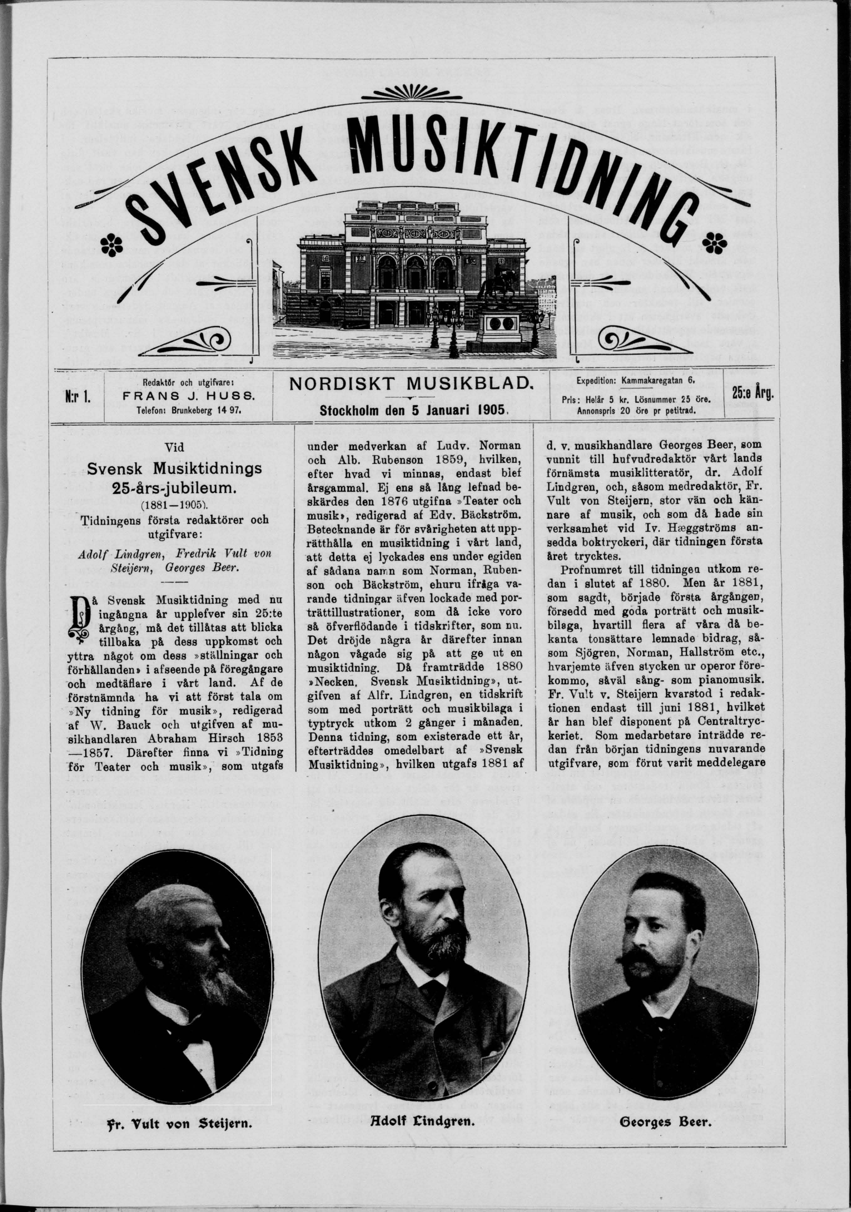 Full resolution (JPEG) - On this page / på denna sida - Titel och innehåll - N:r 1. 5 Januari 1905 - Vid Svensk Musiktidnings 25-års-jubileum (1881—1905). Tidningens första redaktörer och utgifvare: Adolf Lindgren, Fredrik Vult von Steijern, Georges Beer (med porträtter och biografier), af Fr. Joh. Huss och S. S—n