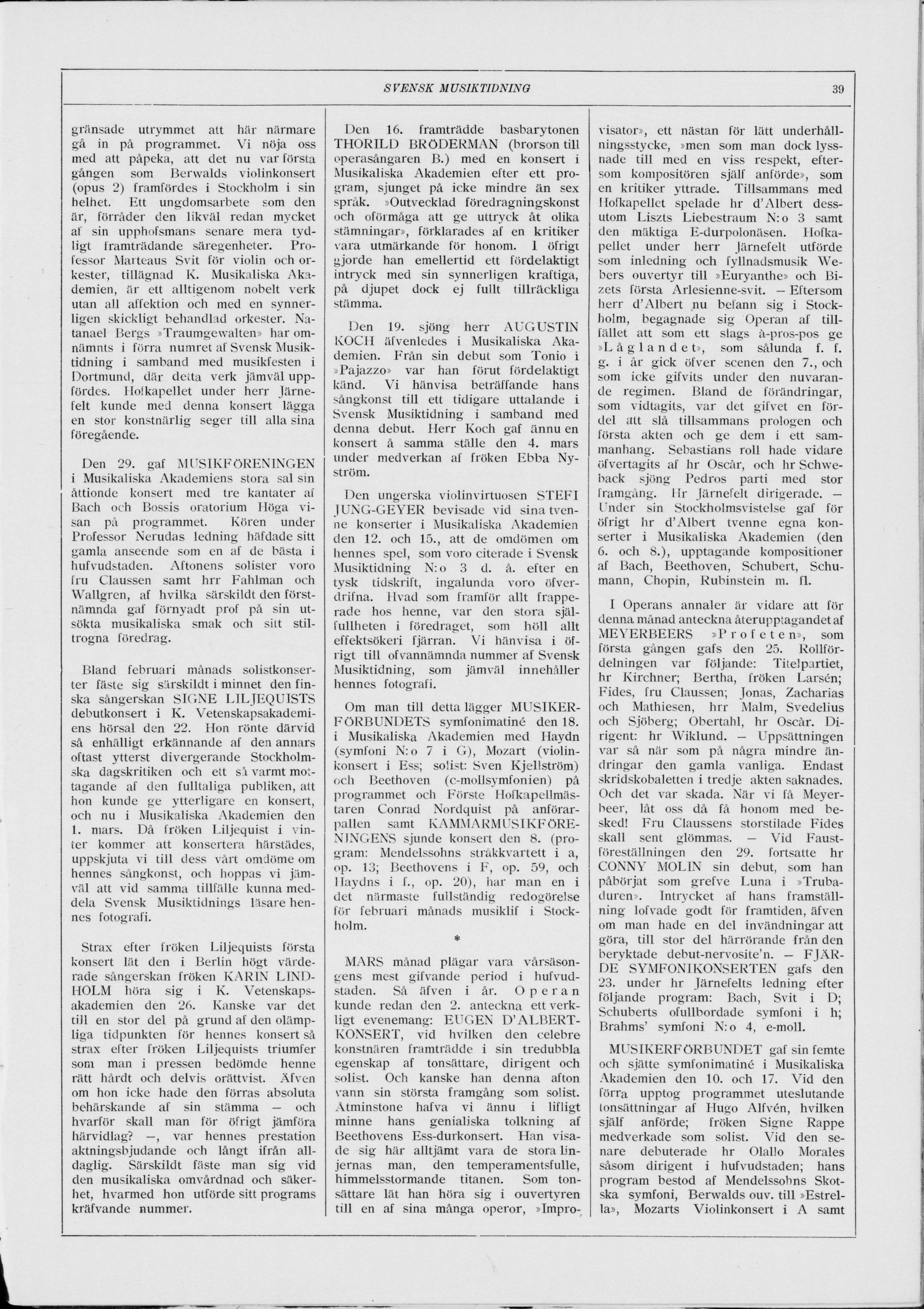 Akademien. Från sin debut som Tonio i »Pa jazzo» var han förut fördelaktigt känd. Vi hänvisa beträffande hans sångkonst till ett tidigare uttalande i Svensk Musiktidning i samband med denna debut. Herr Koch gaf ännu en konsert å samma ställe den 4. mars under medverkan af fröken Ebba
