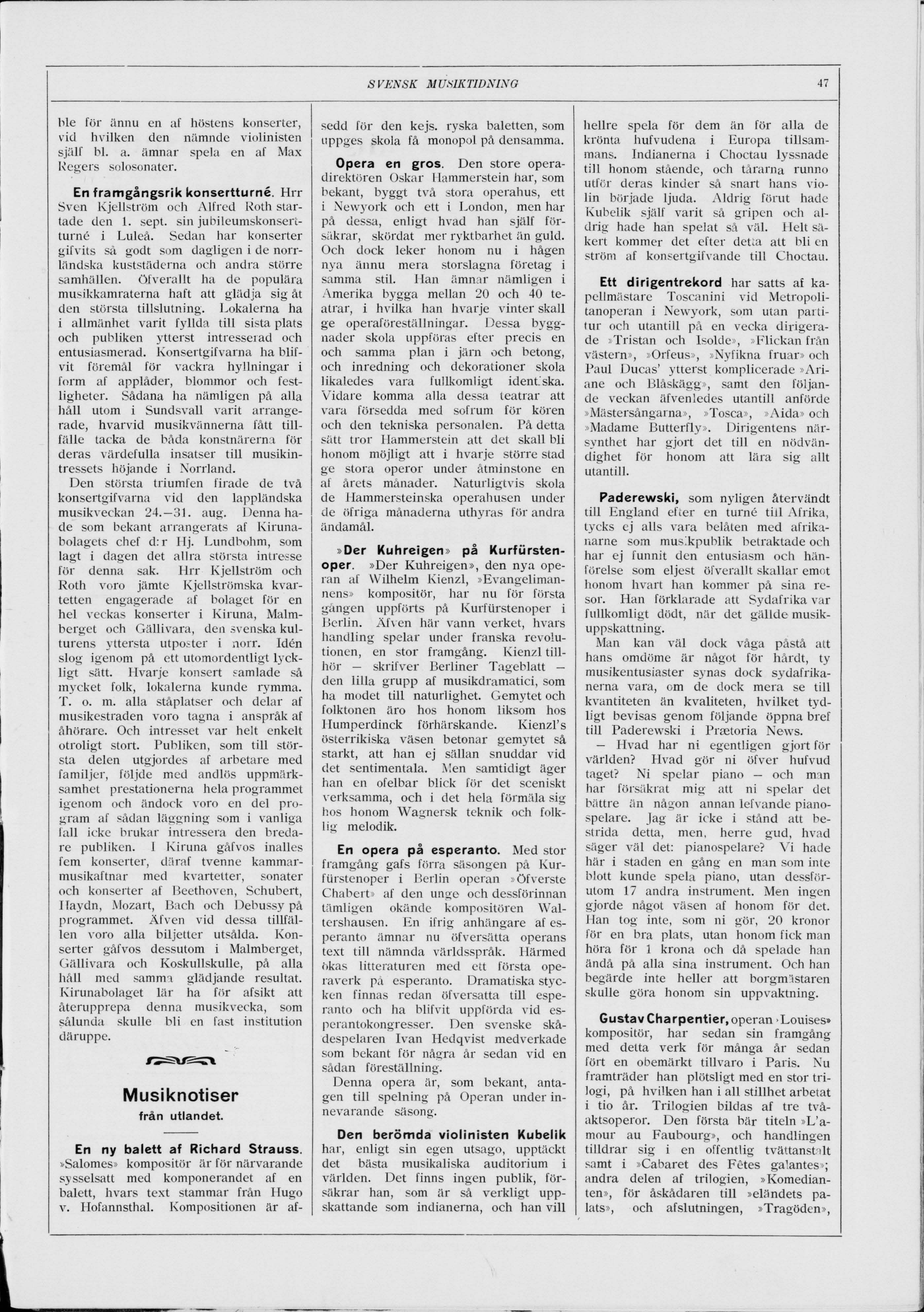 Full resolution (JPEG) - On this page / på denna sida - N:r 6—7. 25 September 1912 - Musiknotiser från hufvudstaden och landsorten - Kammarmusikföreningen - En framgångsrik konsertturné - Musiknotiser från utlandet - En ny balett af Richard Strauss - Opera en gros - »Der Kuhreigen» på Kurfürstenoper - En opera på esperanto - Den berömda violinisten Kubelik - Ett dirigentrekord - Paderewski - Gustav Charpentier