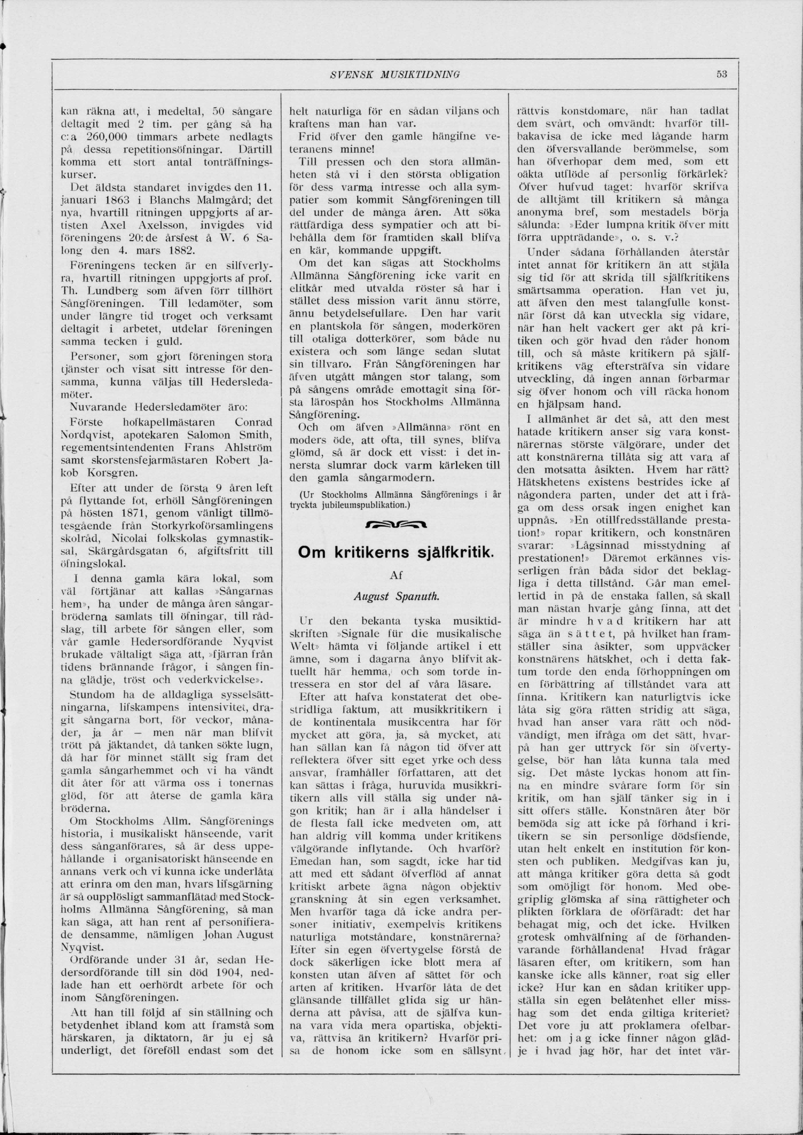 Full resolution (JPEG) - On this page / på denna sida - N:r 8—9. 15 Oktober 1912 - Ur Stockholms Allmänna sångförenings historia - Om kritikerns själfkritik, af August Spanuth