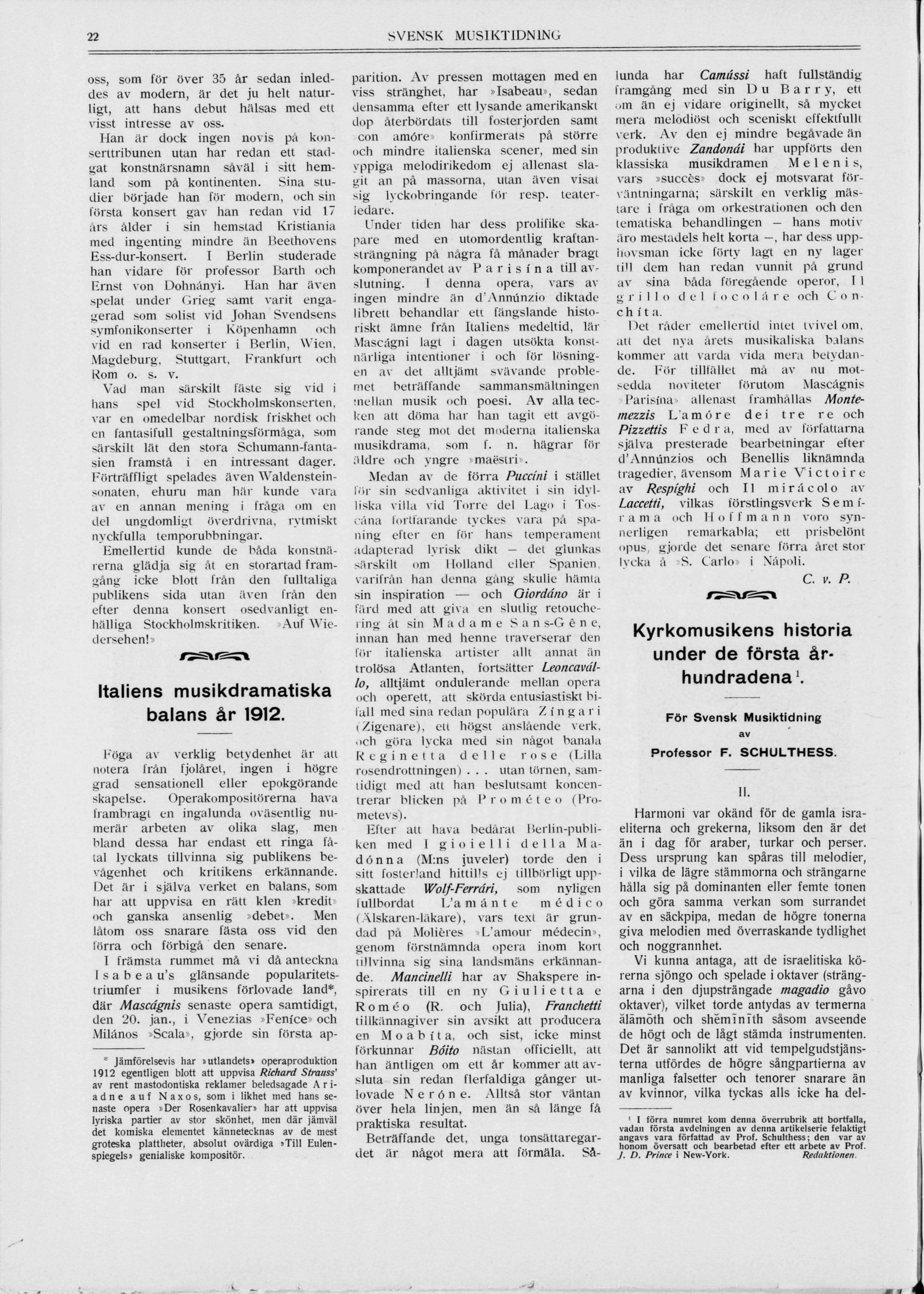 Full resolution (JPEG) - On this page / på denna sida - N:r 3. 15. Februari 1913 - Trenne utländska konsertgifvare i Stockholm (med 3 porträtt) - Italiens musikdramatiska balans 1912, av C. v. P. - Kyrkomusikens historia under de första århundradena. II, av F. Schulthess efter J. D. Prince