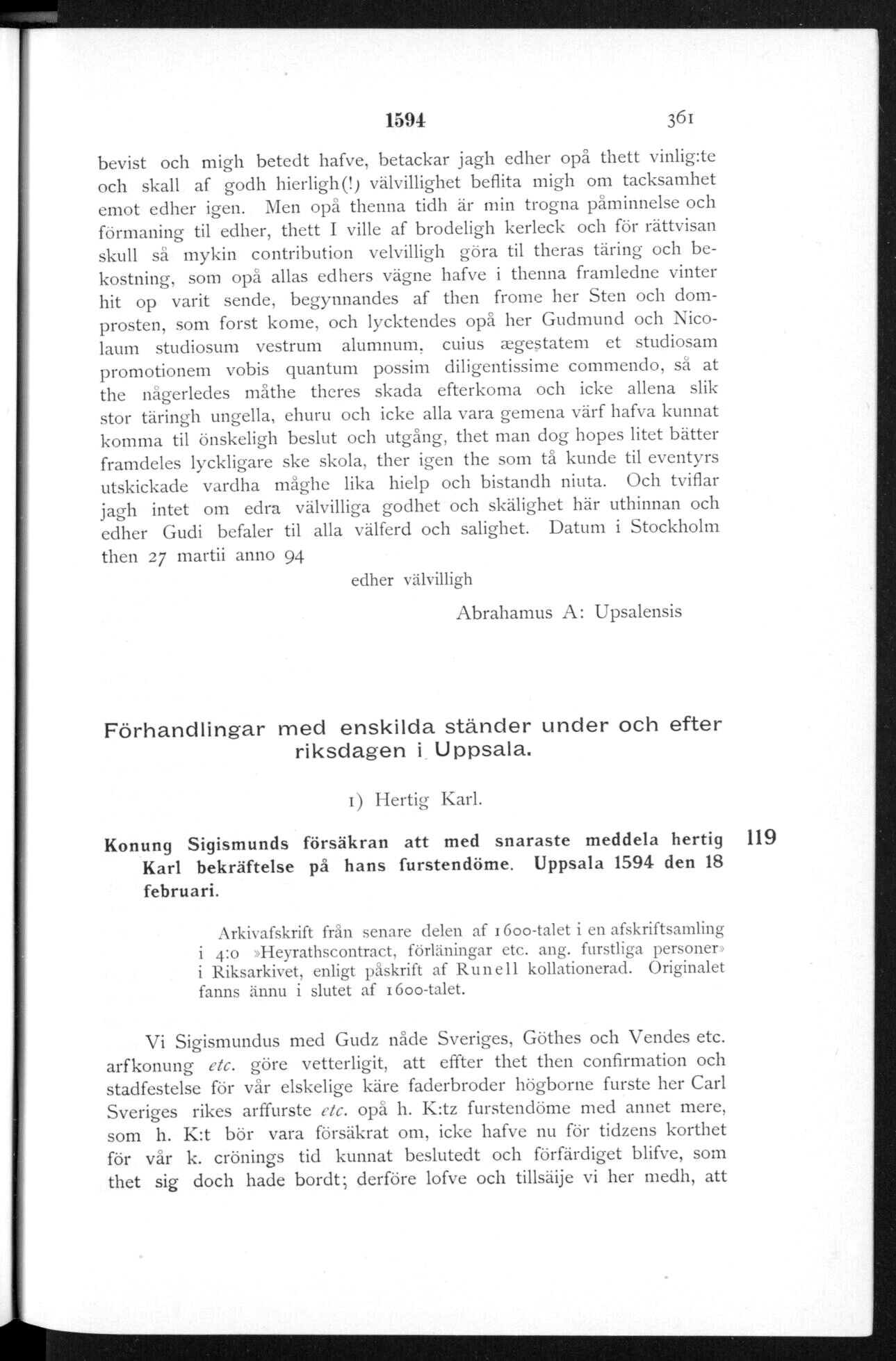 Karl bekräftelse på hans furstendöme. Uppsala 1594 den 18