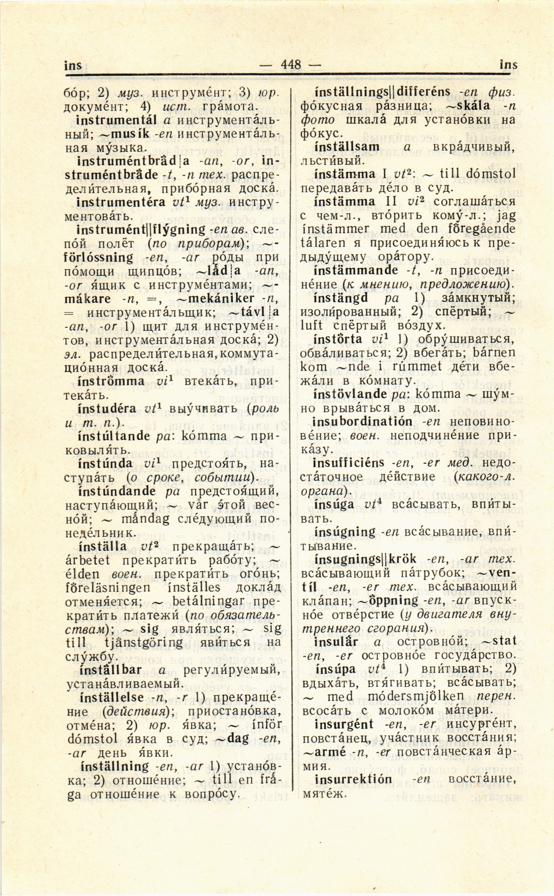 прибо́р; 2) муз. инструме́нт; 3) юр.