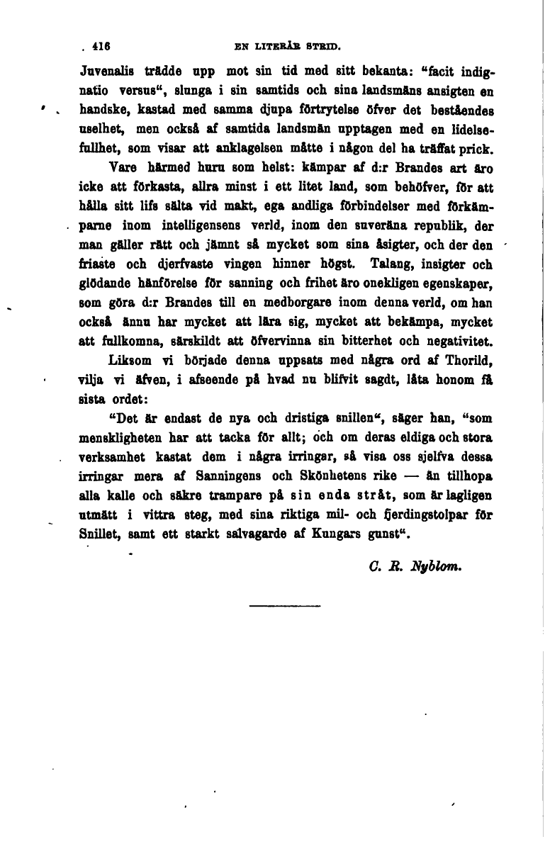 Full resolution (TIFF) - On this page / på denna sida - C. R. Nyblom: En literär strid: (Brandes Hovedströmninger i vår tids literatur)