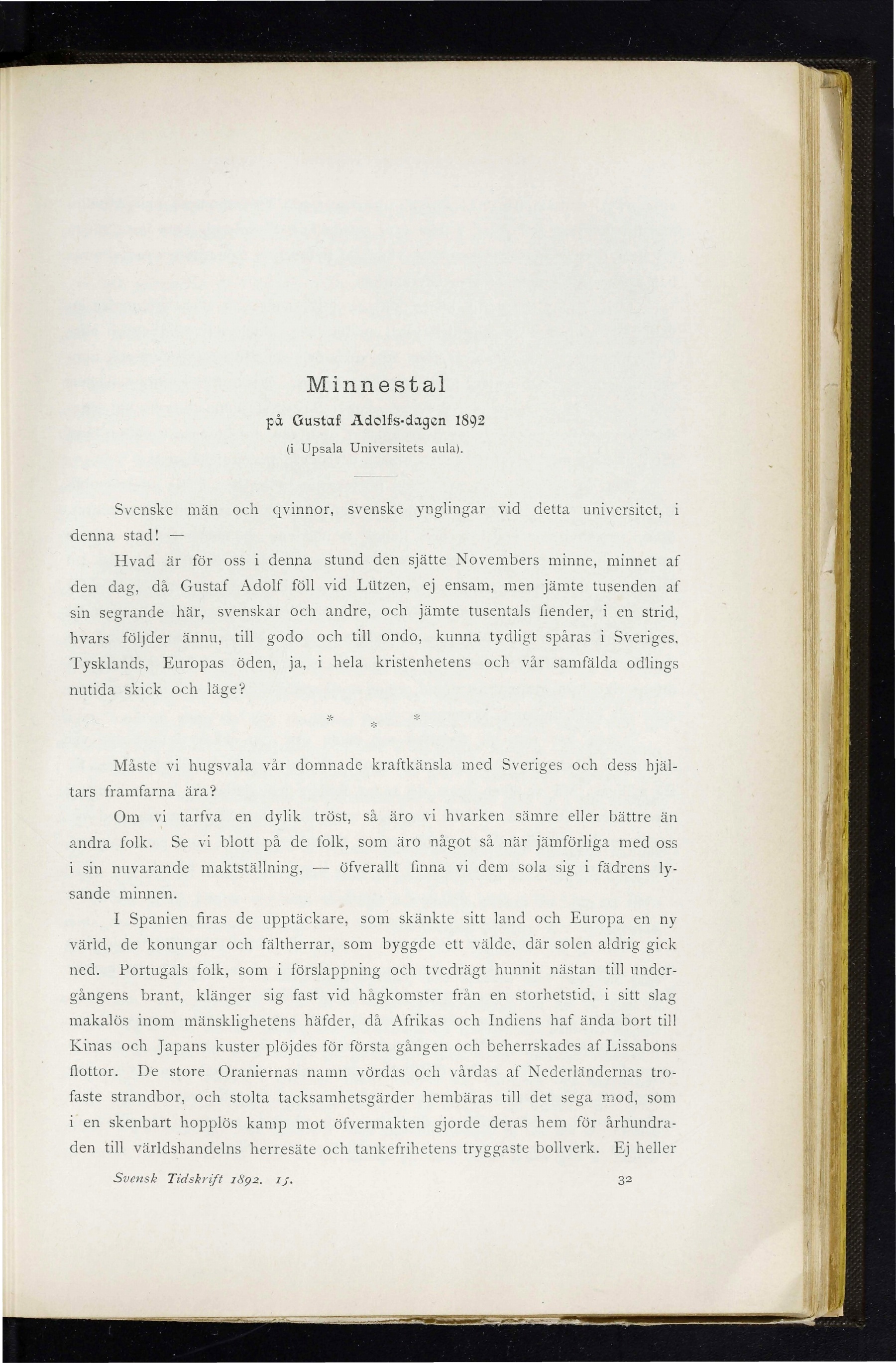 - Harald Hjärne: Minnestal på Gustaf-Adolfs-dagen 1892