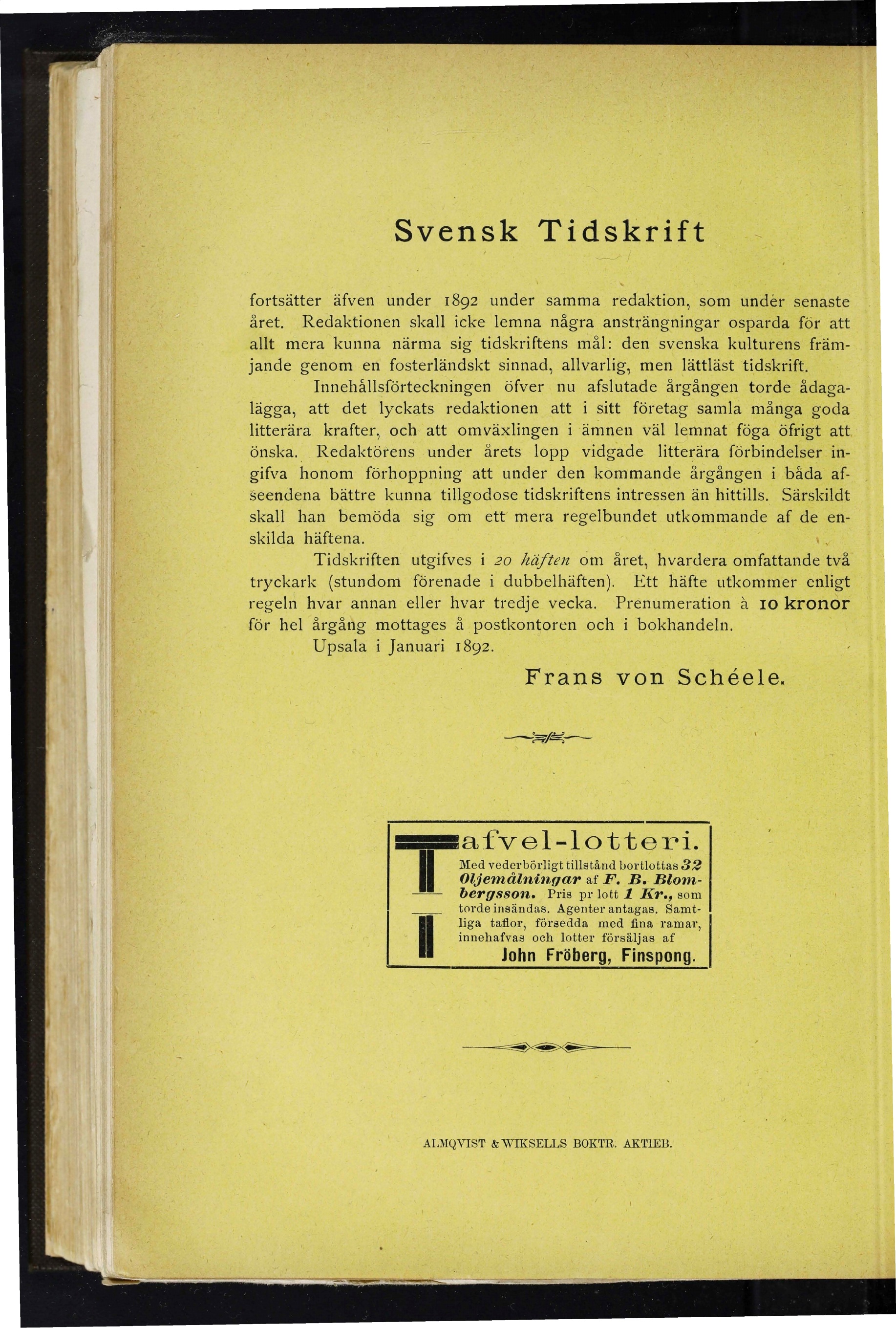 för hel årgång mottages å postkontoren och 1 bokhandeln.