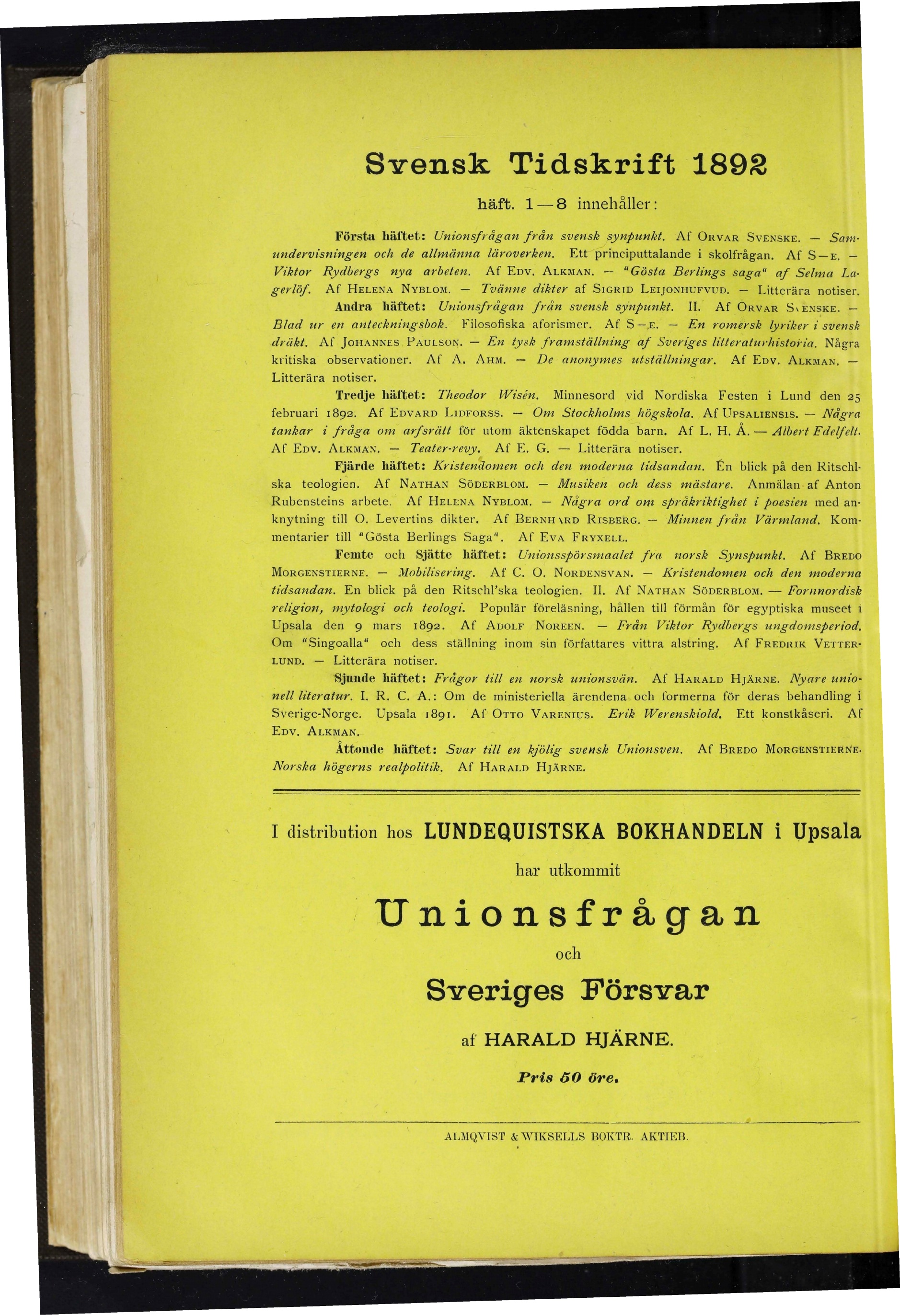 Andra häftet: Uni’onsfråg·an från svensk synpunkt. II. Af ORVAR S, ENSKE. -