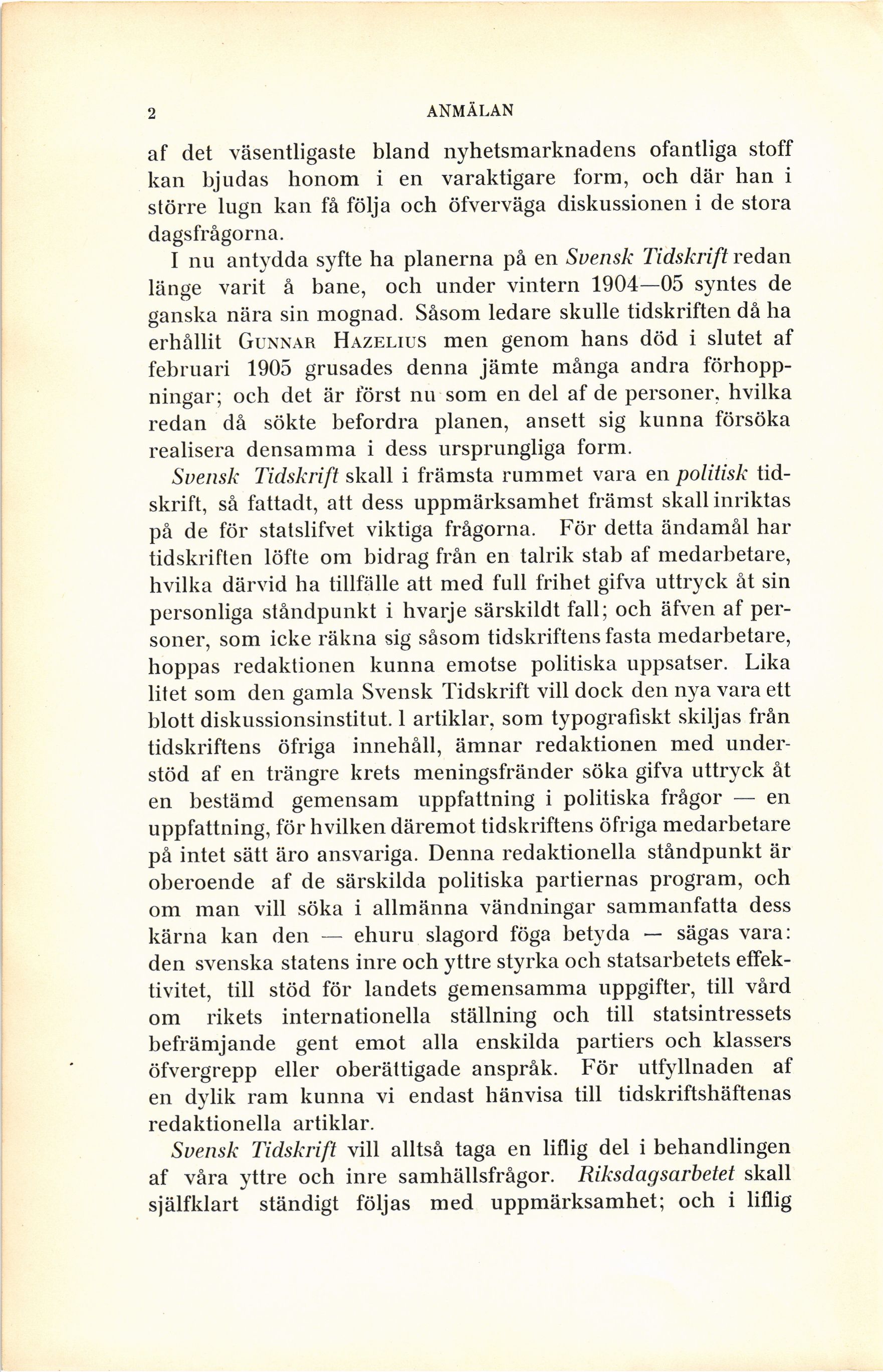 Svensk Tidskrift skall i främsta rummet vara en politisk