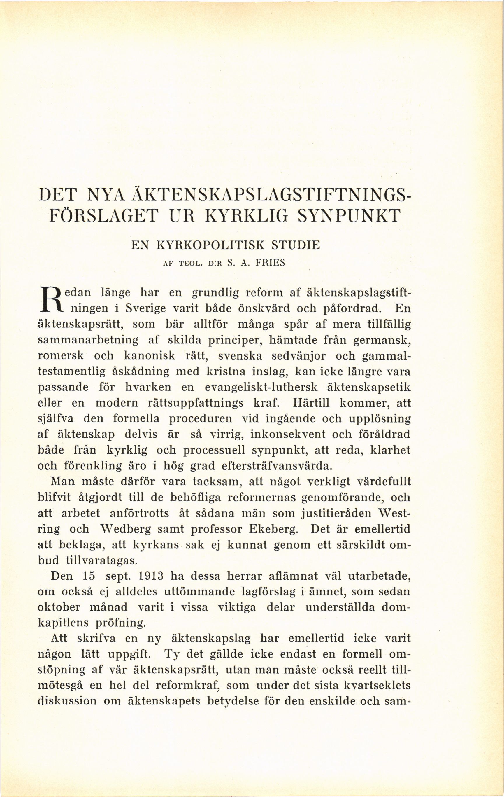 - Det nya äktenskapslagstiftningsförslaget ur kyrklig synpunkt. Af S. A. Fries