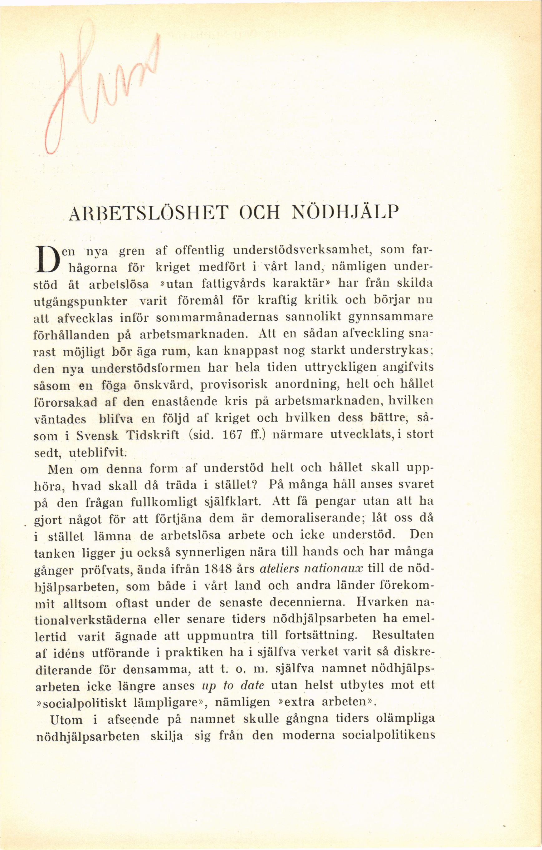 understöd åt arbetslösa »utan fattigvårds karaktär» har från skilda