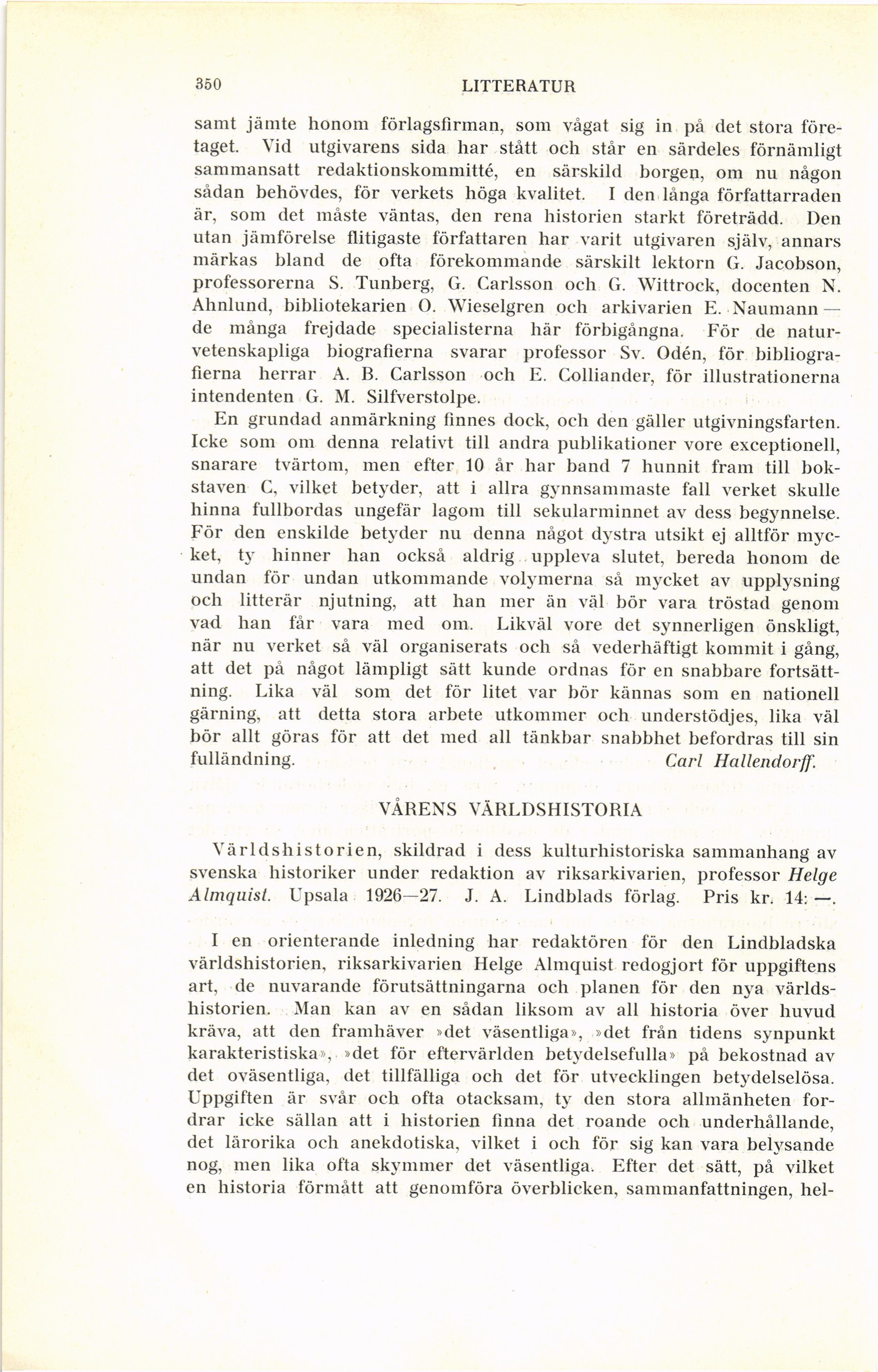Full resolution (JPEG) - On this page / på denna sida - Häfte 5 - Litteratur - Svenskt Biografiskt Lexikon. Av Carl Hallendorff - Vårens världshistoria. Av Bror Olsson - Helge Almquist (red.): Världshistorien
