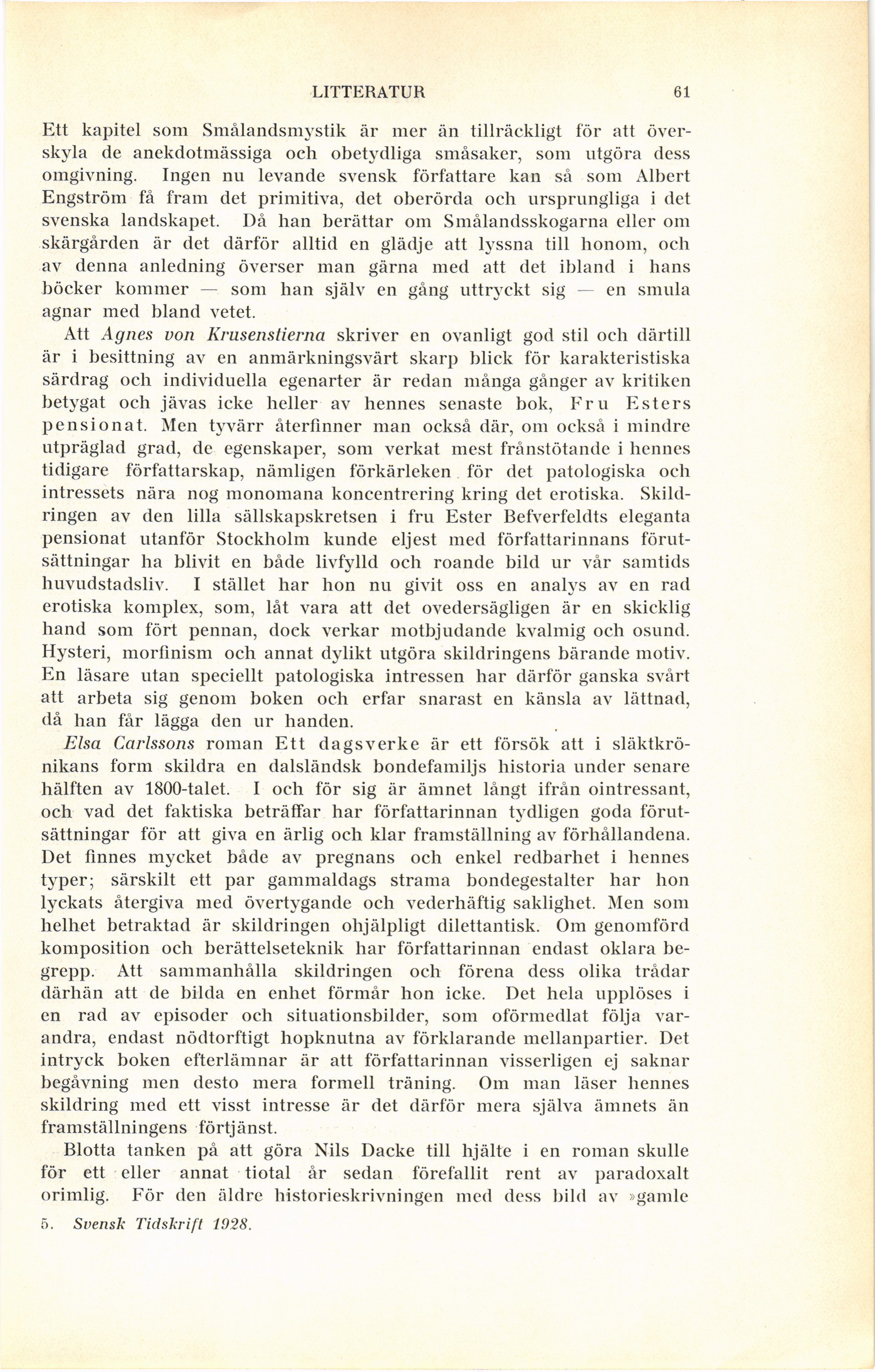 Full resolution (JPEG) - On this page / på denna sida - Häfte 1 - Litteratur - Nyare svensk prosakonst. Av O. Wieselgren - Agnes von Krusenstjerna: Fru Esters pensionat - Elsa Carlsson: Ett dagsverke