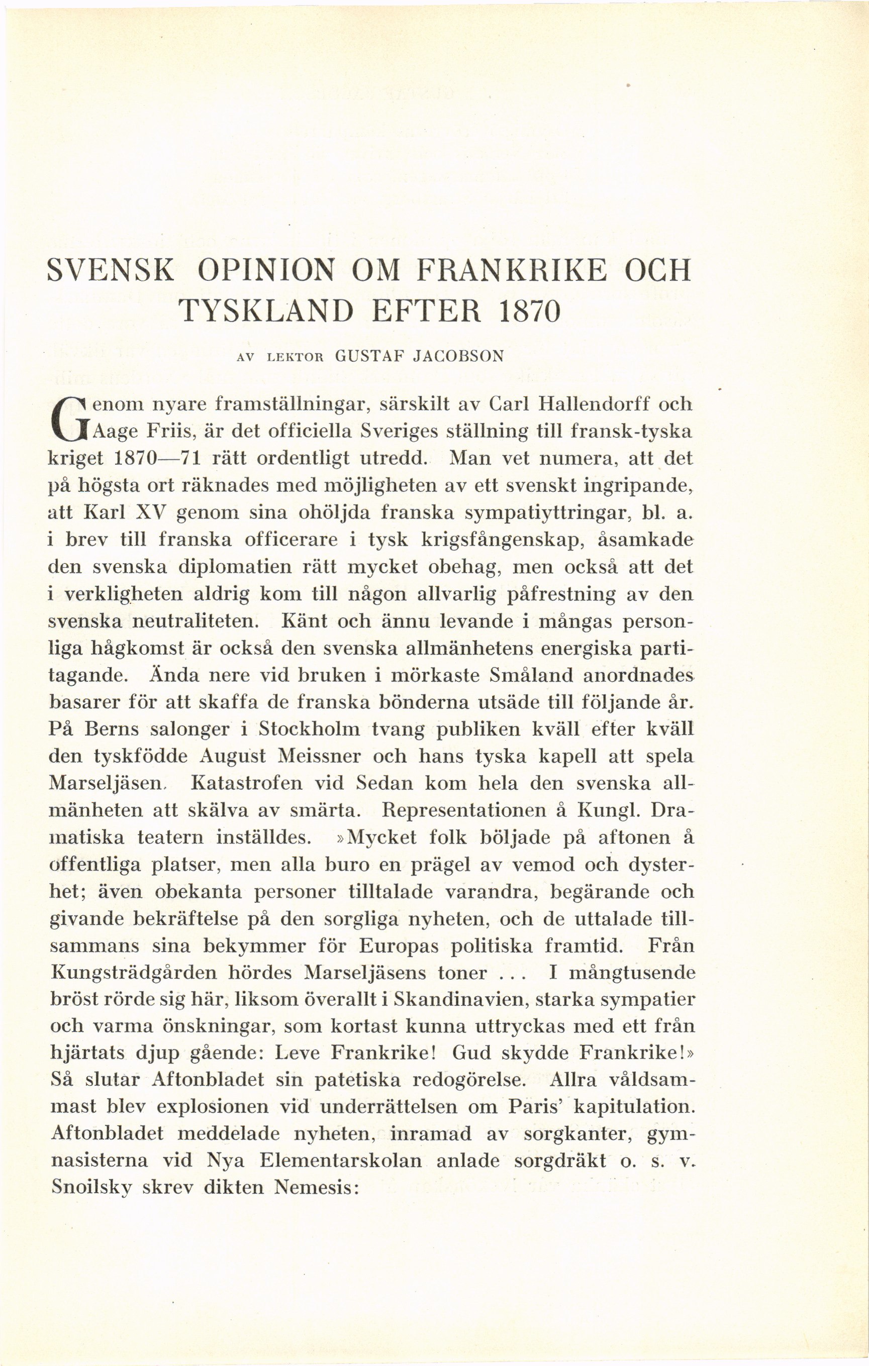 - Svensk opinion om Frankrike och Tyskland efter 1870. Av Gustaf Jacobson