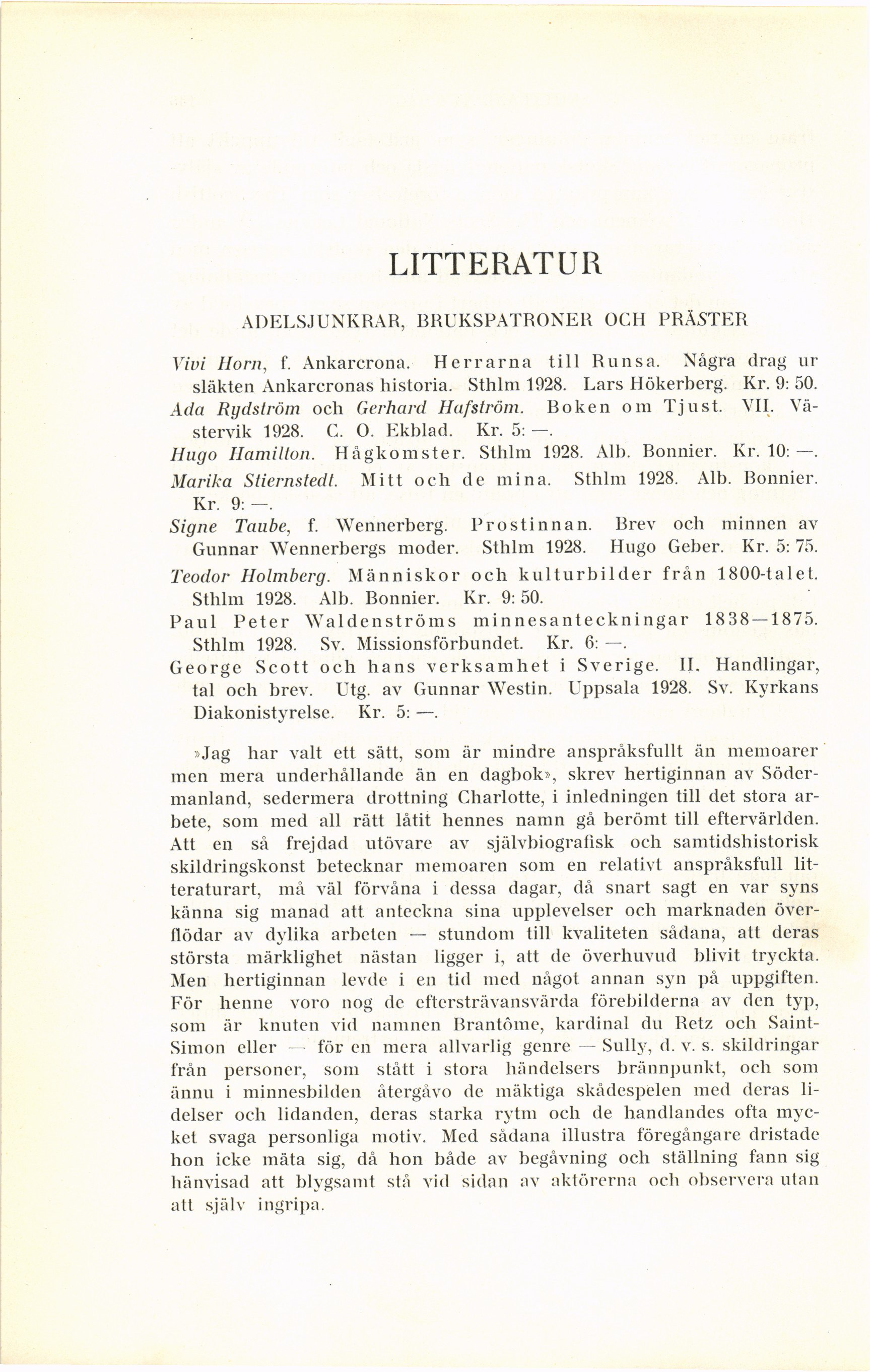 Vivi Horn, f. Ankarcrona. Herrarna till Runsa. Några drag ur släkten Ankarcronas historia. Sthlm 1928. Lars Hökerberg. Kr. 9:50.