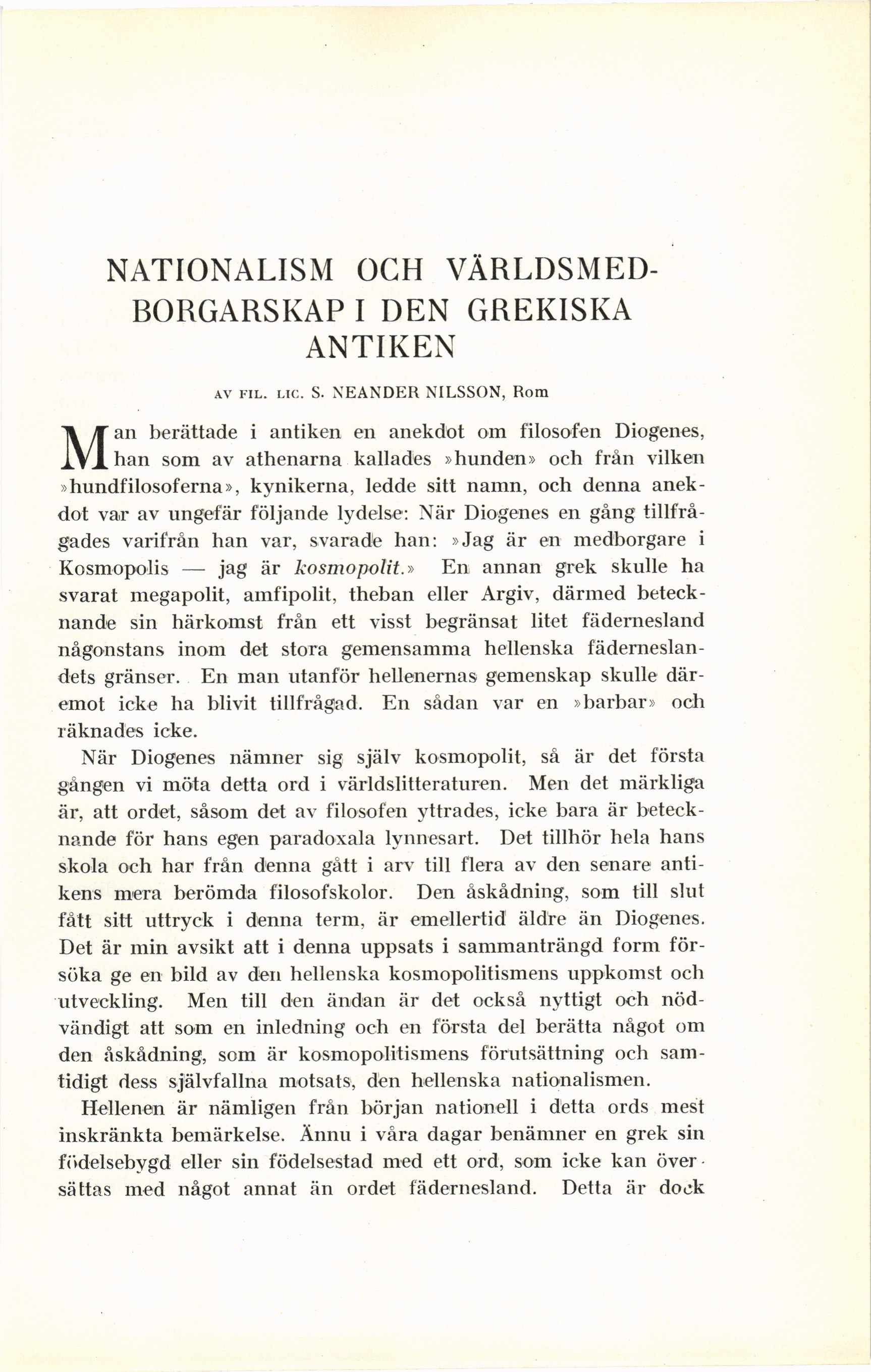 - Nationalism och världsmedborgarskap i den grekiska antiken. Av S. Neander Nilsson