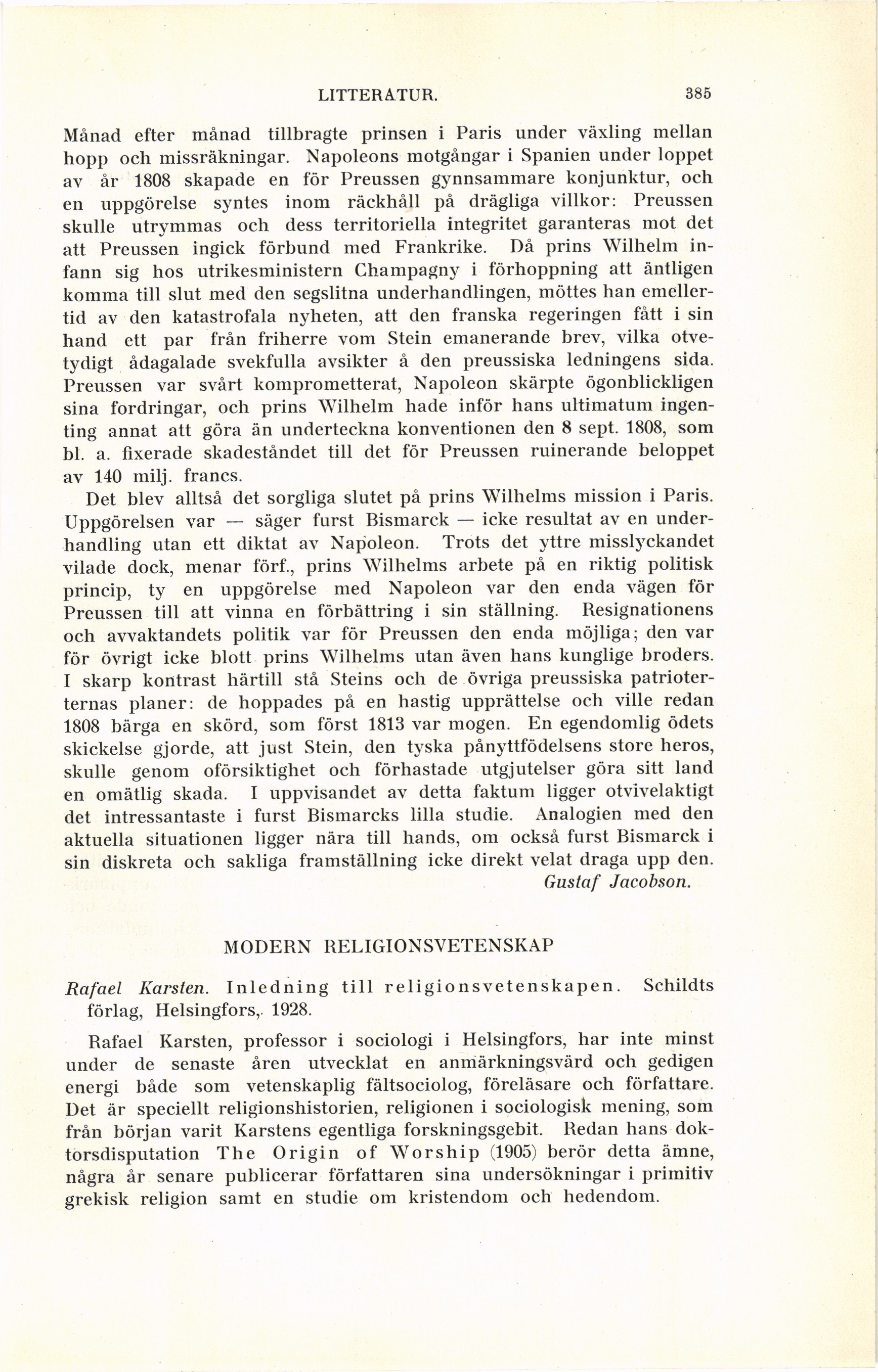 Full resolution (JPEG) - On this page / på denna sida - Häfte 5 - Litteratur - Bismarcks sonson om Preussens förnedring. Av Gustaf Jacobson - Fürst Bismarck: Prinz Wilhelm und Napoleon - Modern religionsvetenskap. Av Ragnar Numelin - Rafael Karsten: Inledning till religionsvetenskapen