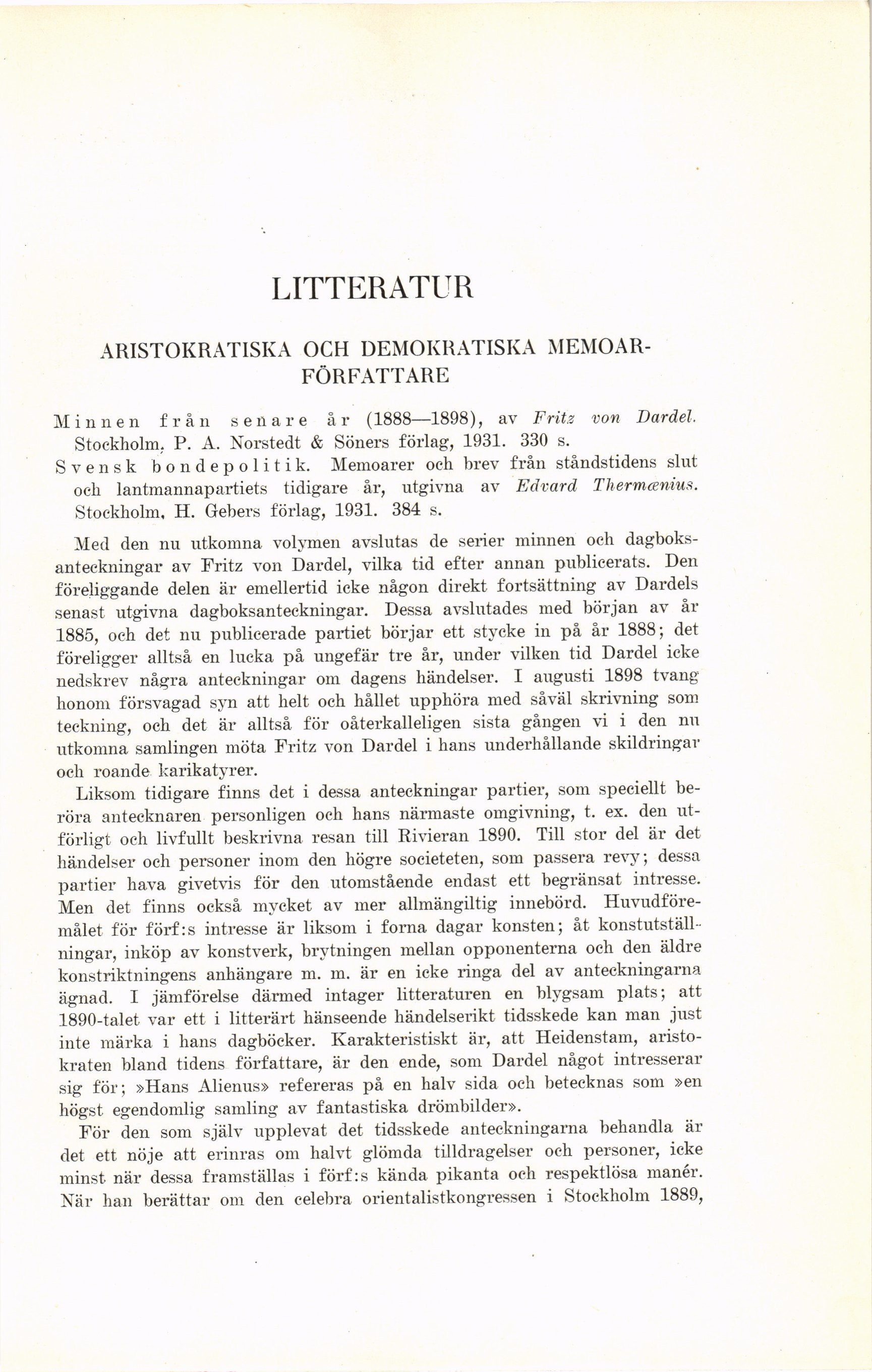 Full resolution (JPEG) - On this page / på denna sida - Häfte 2. 14 mars 1932 - Litteratur - Aristokratiska och demokratiska memoarförfattare. Av Gustaf Jacobson - Fritz v. Dardel: Minnen från senare år - Edvard Thermænius: Svensk bondepolitik