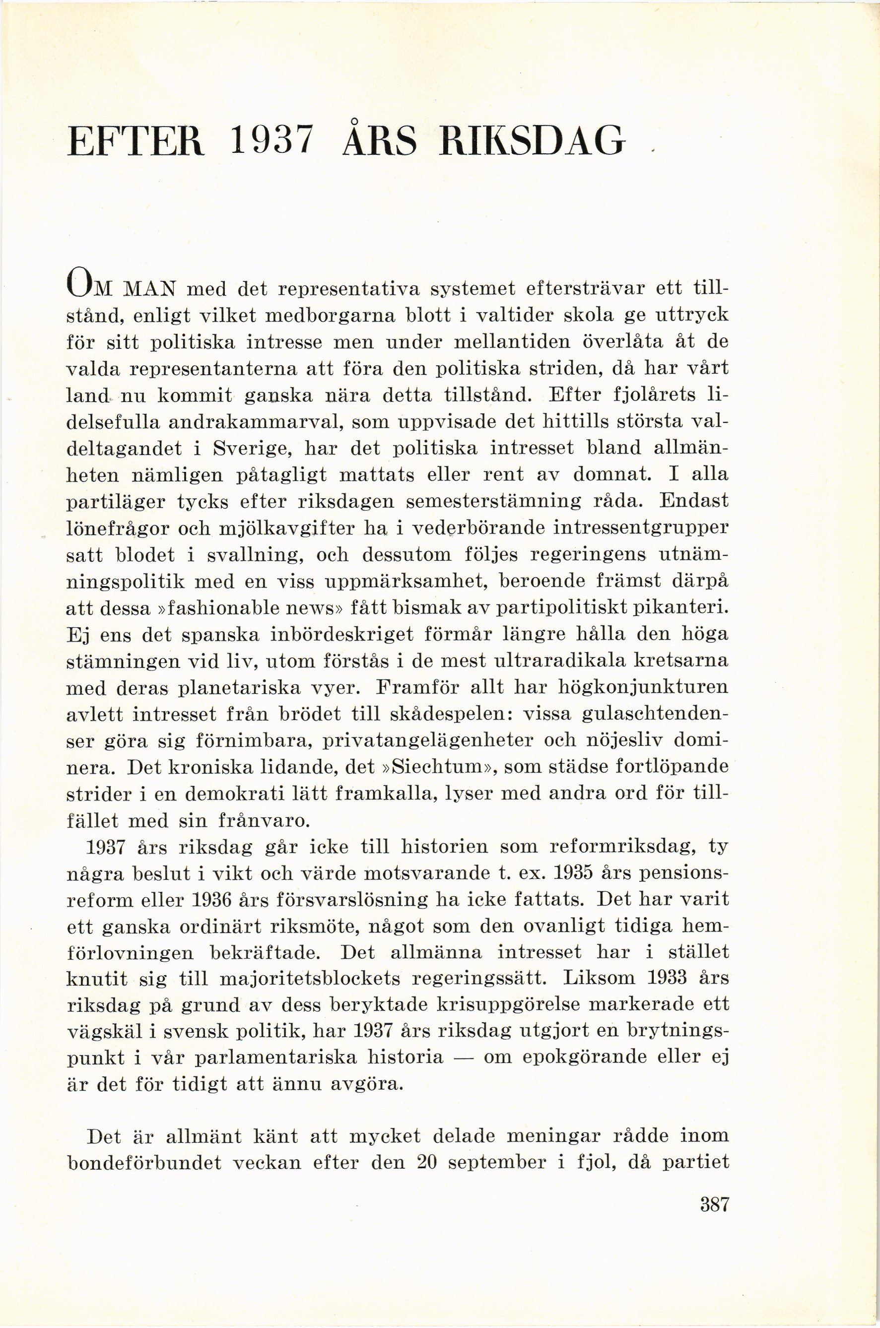 vägskäl i svensk politik, har 1937 års riksdag utgjort en