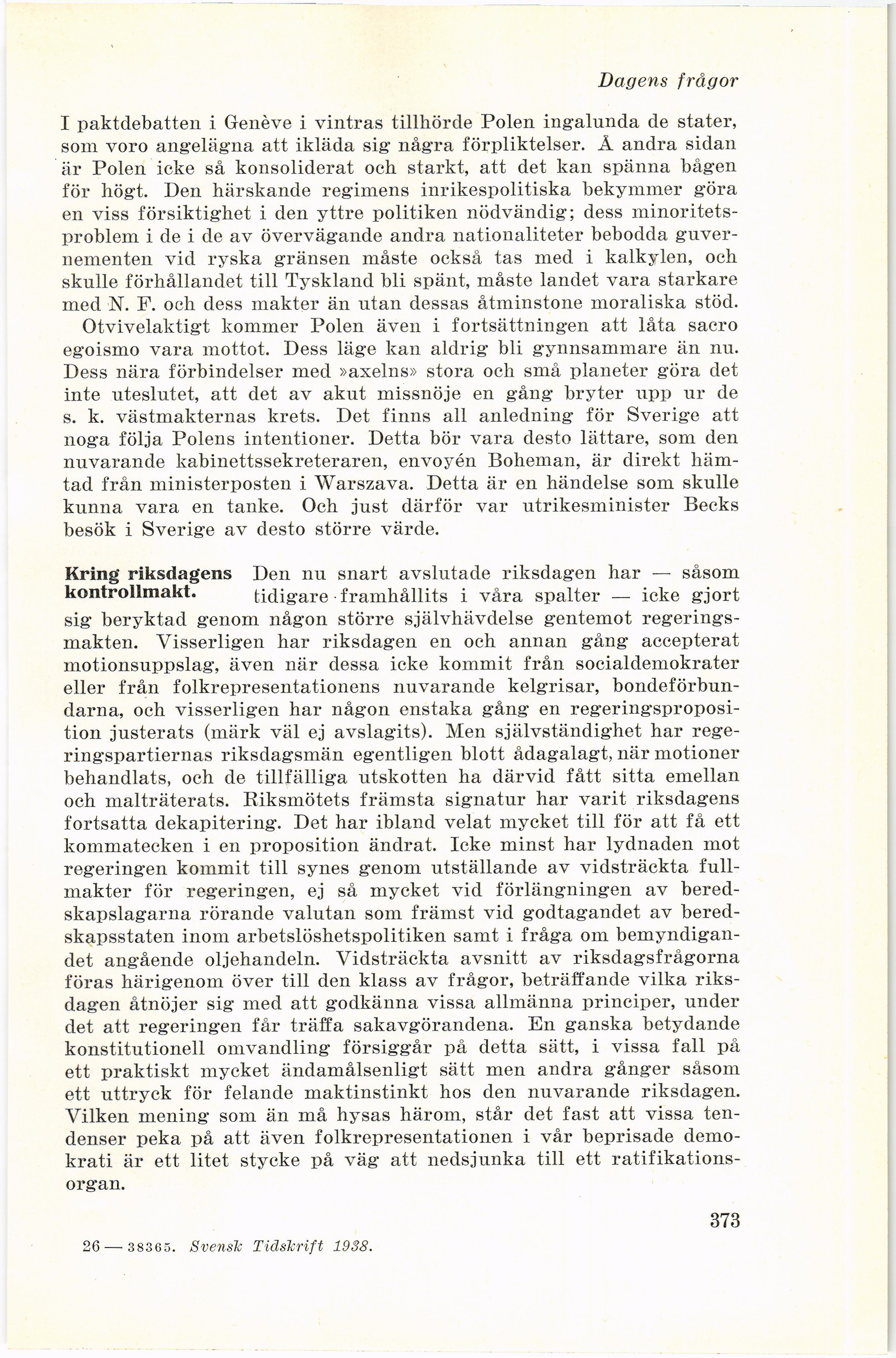 Full resolution (JPEG) - On this page / på denna sida - Häfte 5 - Dagens frågor 28 maj 1938 - Kan någon europeisk stat ensam spränga N. F.? - Kring riksdagens kontrollmakt