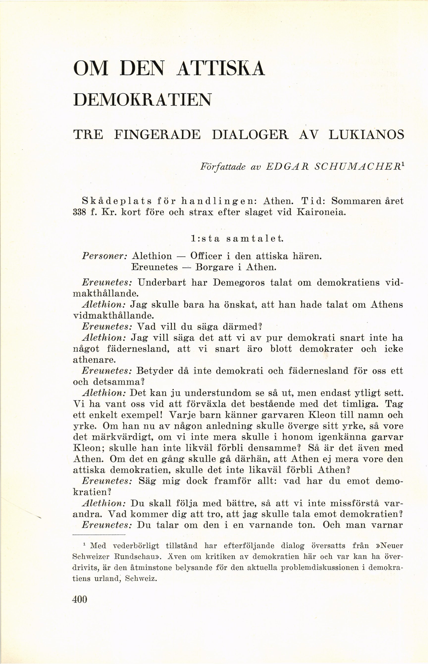- Om den attiska demokratien. Tre fingerade dialoger av Lukianos. Av Edgar Schumacher. Översatt av Emerik Olsoni