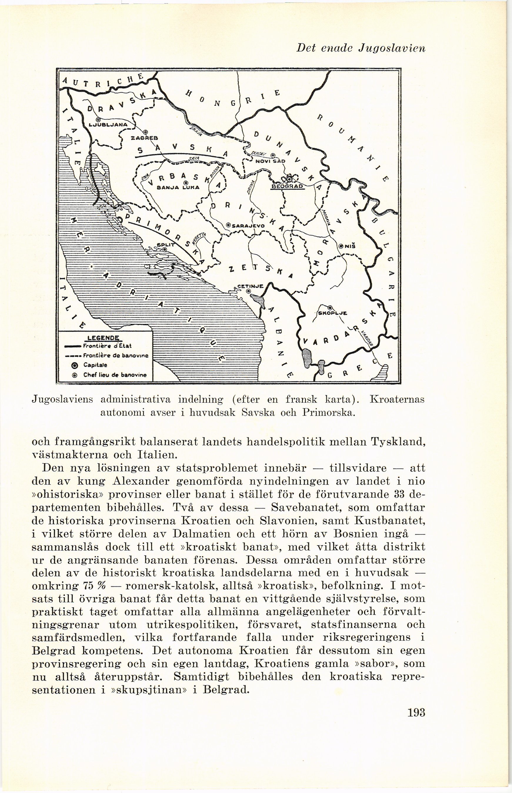 Jugoslaviens administrativa indelning (efter en fransk karta). Kroaternas autonomi avser i huvudsak Savska och Primorska. |