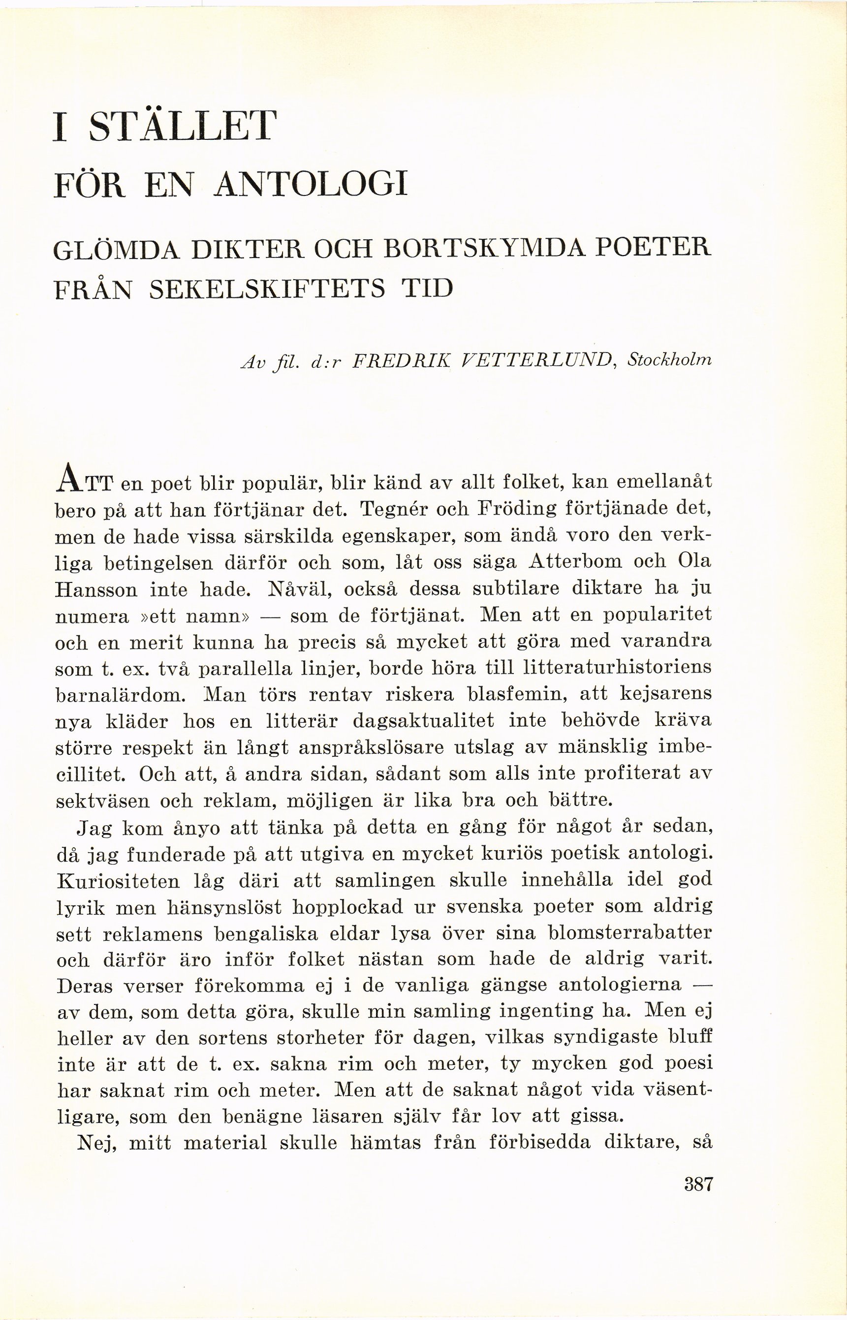 - I stället för en antologi. Av Fredrik Vetterlund