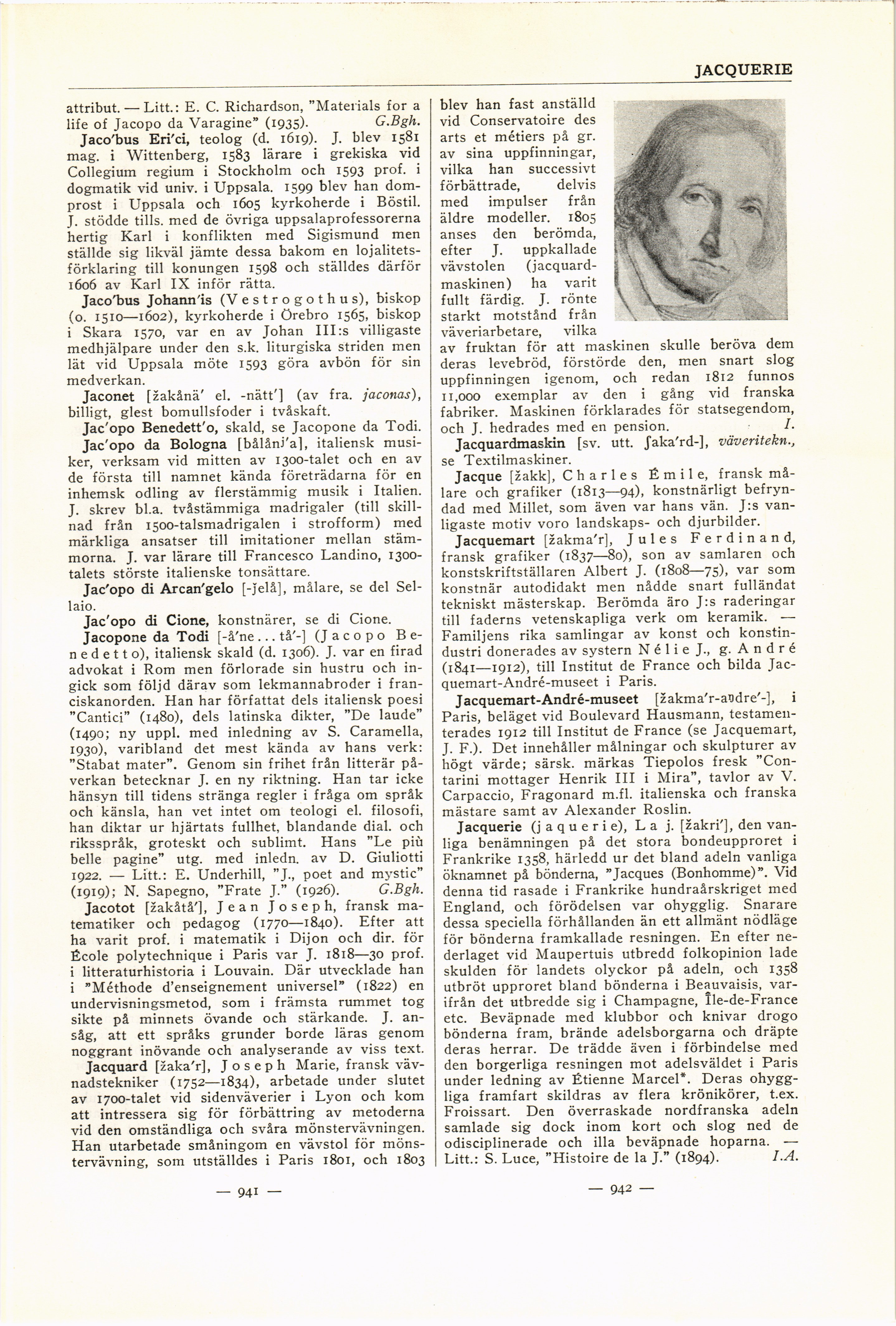 Full resolution (JPEG) - On this page / på denna sida - Jacobus a Voragine - Jacobus Erici - Jacobus Johannis (Vestrogothus) - Jaconet - Jacopo Benedetto - Jacopo da Bologna - Jacopo di Arcangelo - Jacopo di Cione - Jacopone da Todi (Jacopo Benedetto) - Jacotot, Jean Joseph - Jacquard, Joseph - Jacquardmaskin - Jacque, Charles Émile - Jacquemart, Jules Ferdinand - Jacquemart-André-museet - Jacquerie (jaquerie), La