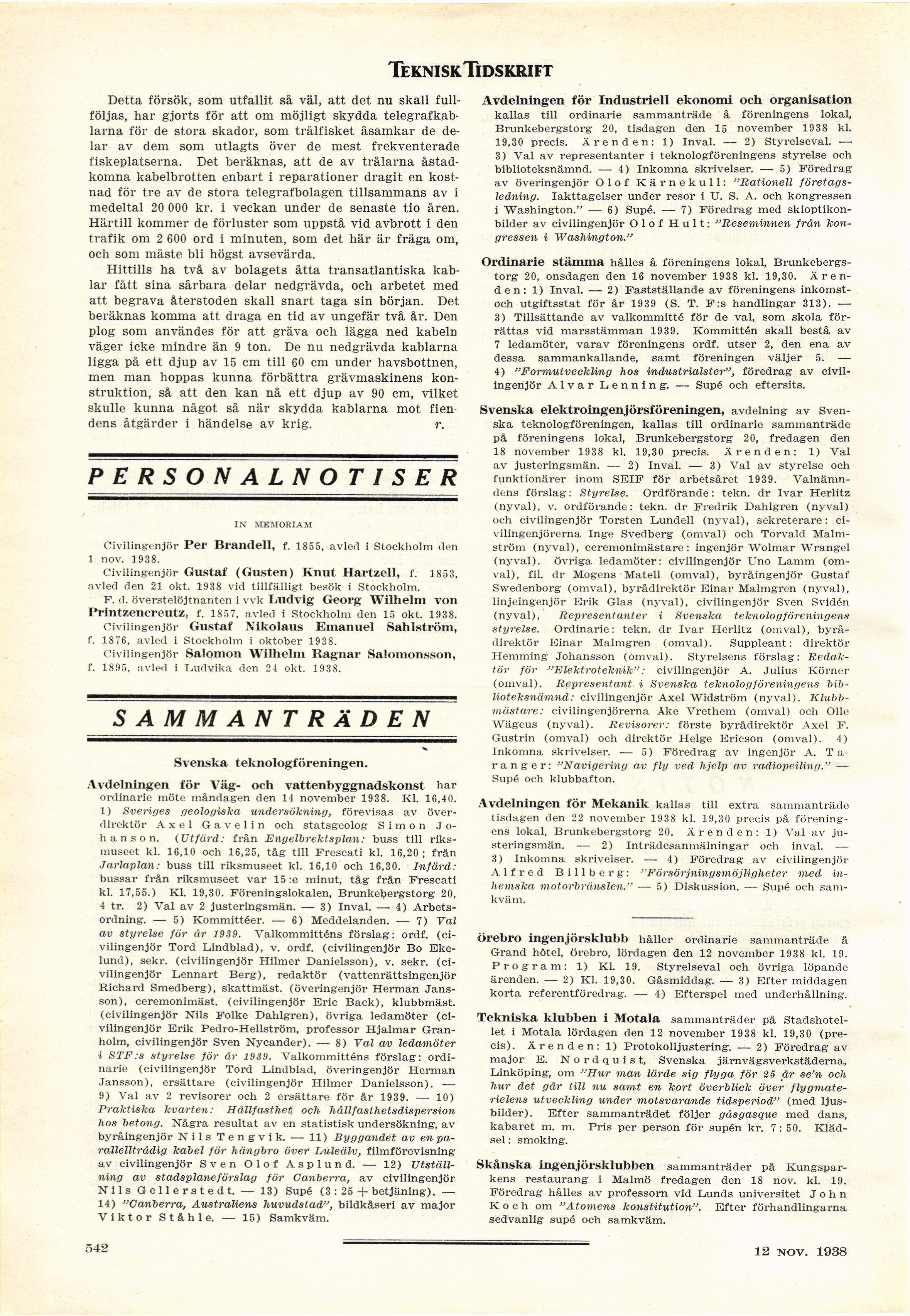 Full resolution (JPEG) - On this page / på denna sida - Häfte 45. 12 nov. 1938 - Notiser - Ett dike på havsbotten, av r. - Personalnotiser - Sammanträden