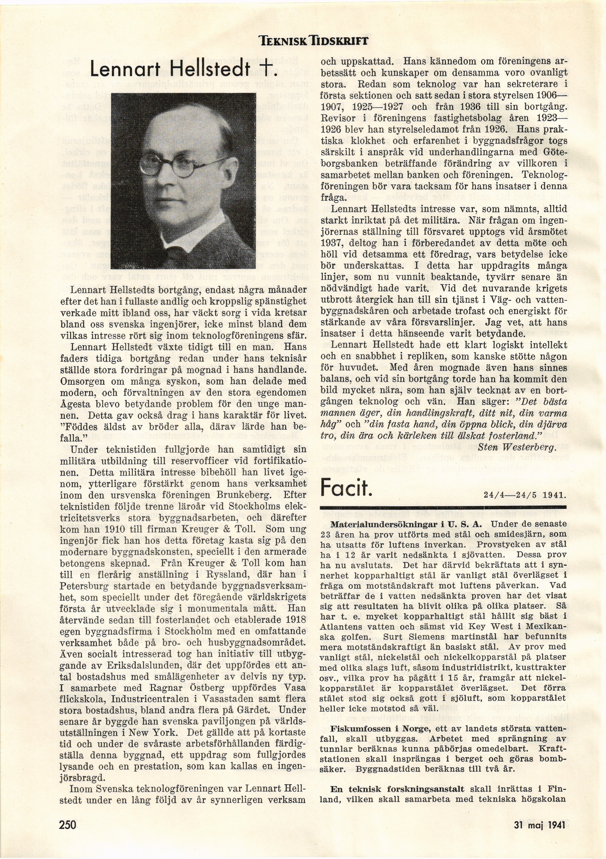 Full resolution (JPEG) - On this page / på denna sida - Häfte 22. 31 maj 1941 - Lennart Hellstedt †, av Sten Westerberg - Facit - Materialundersökningar i U. S. A. - Fiskumfossen i Norge - En teknisk forskningsanstalt