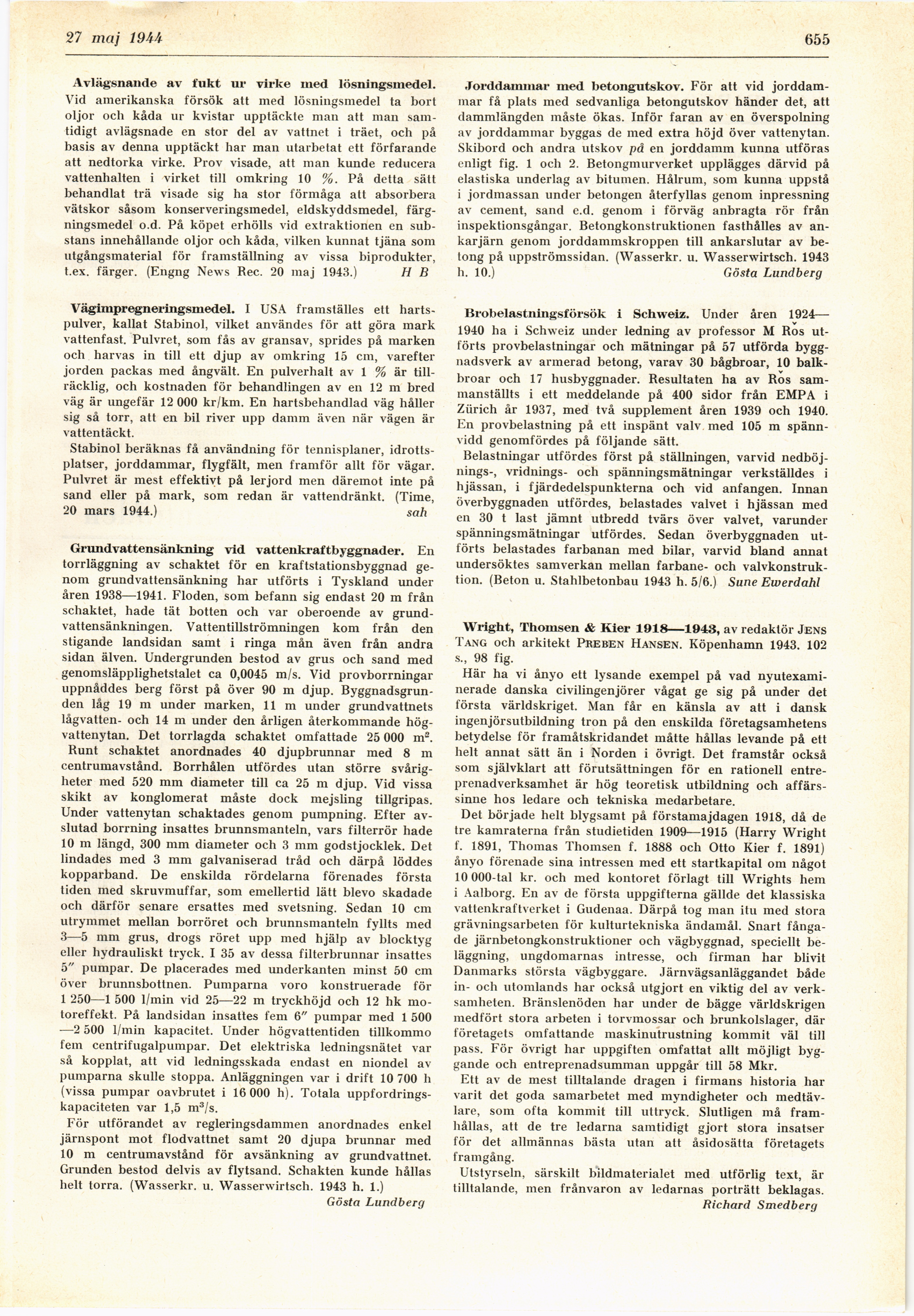 Full resolution (JPEG) - On this page / på denna sida - H. 21. 27 maj 1944 - Avlägsnande av fukt ur virke med lösningsmedel, av H B - Vägimpregneringsmedel, av sah - Grundvattensänkning vid vattenkraftbyggnader, av Gösta Lundberg - Jorddammar med betongutskov, av Gösta Lundberg - Brobelastningsförsök i Schweiz, av Sune Ewerdahl - Wright, Thomsen & Kier 1918—1943, av Richard Smedberg
