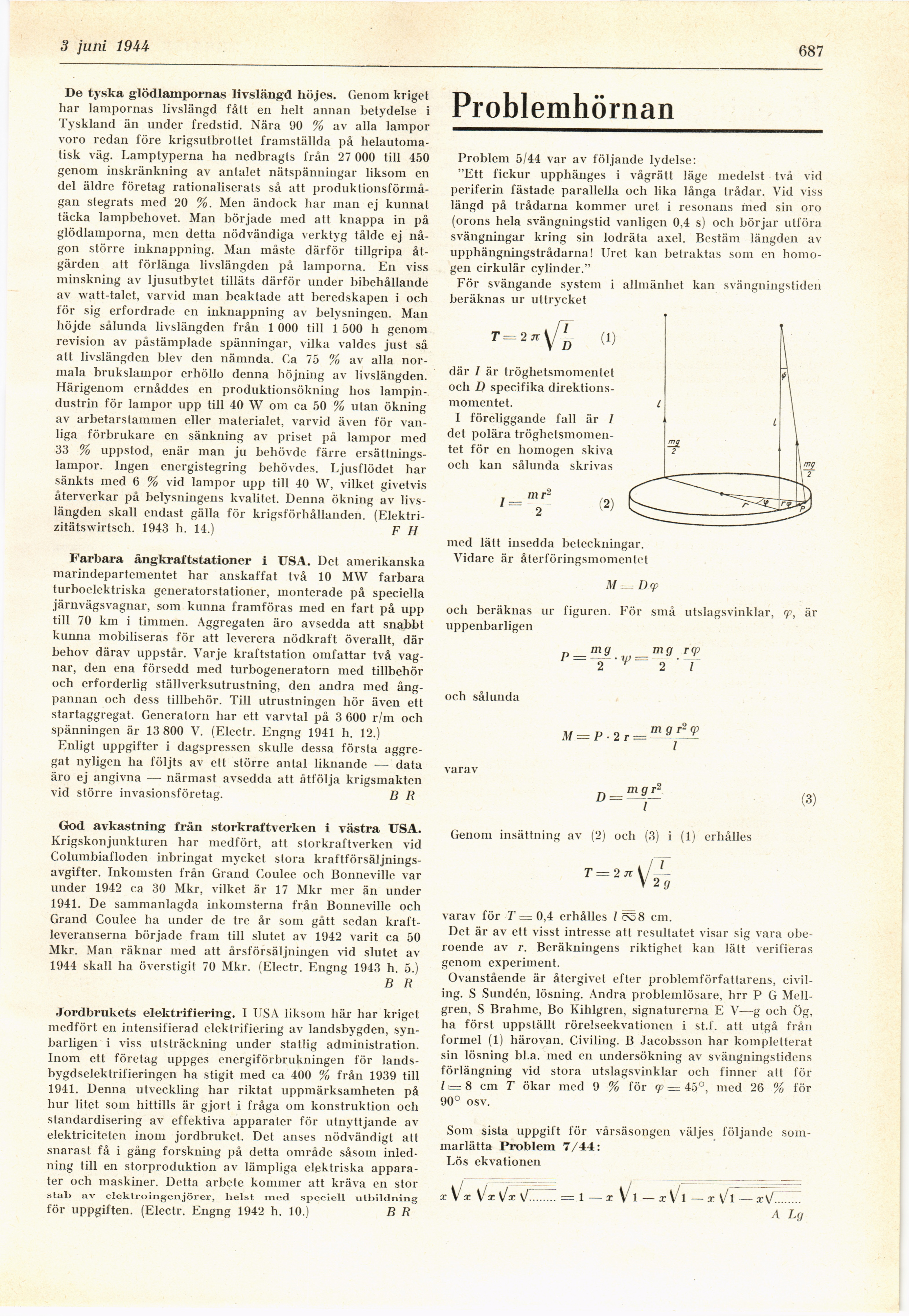 Full resolution (JPEG) - On this page / på denna sida - H. 22. 3 juni 1944 - De tyska glödlampornas livslängd höjes, av F H - Farbara ångkraftstationer i USA, av B R - God avkastning från storkraftverken i västra USA, av B R - Jordbrukets elektrifiering, av B R - Problemhörnan, av A Lg