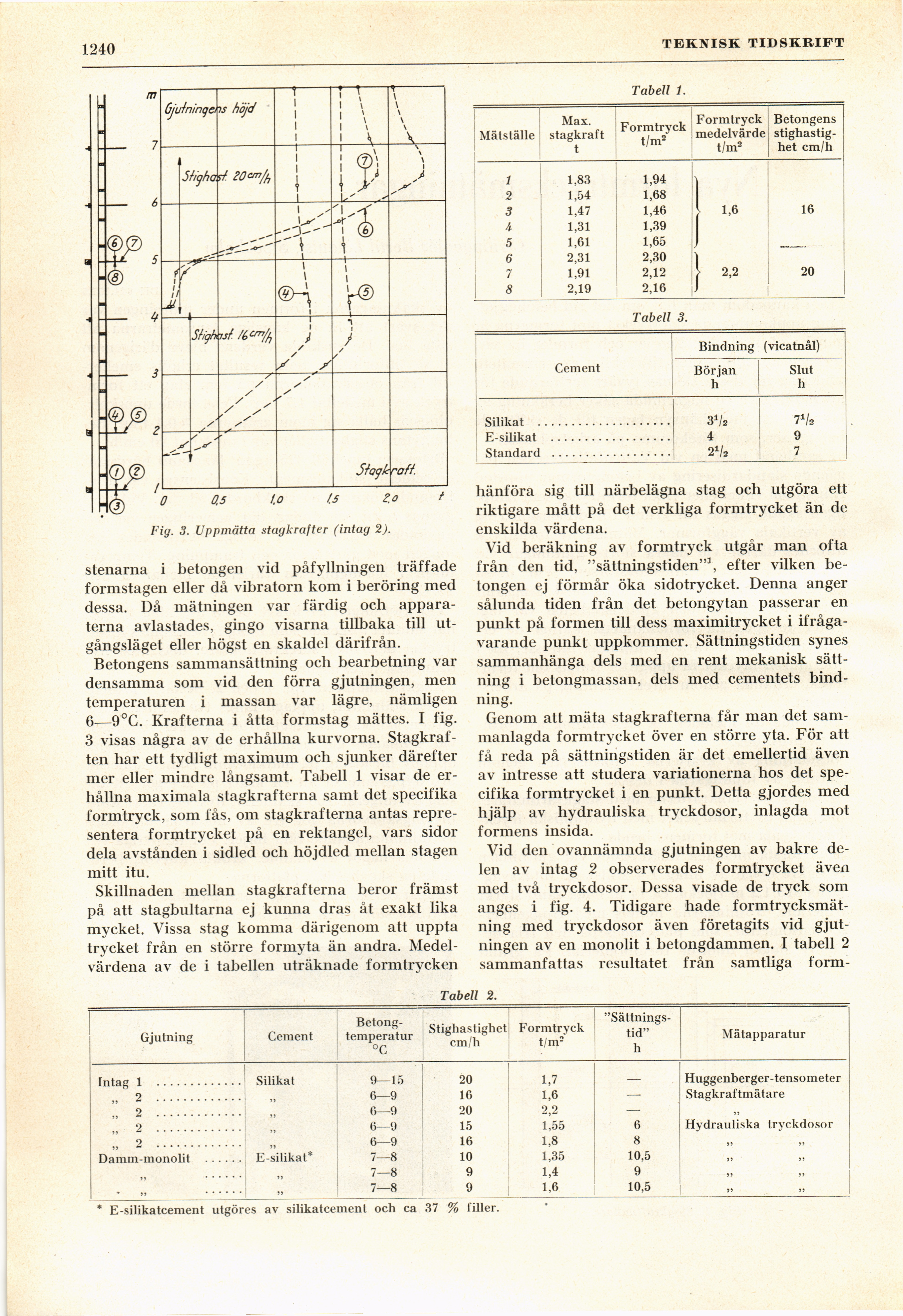j Gjutning Cement [-Betongtemperatur-] {+Betong- temperatur+} °C Stighastighet cm/h Formtryck t/m2 [-"Sättningstid"-] {+"Sättnings- tid"+} h Mätapparatur