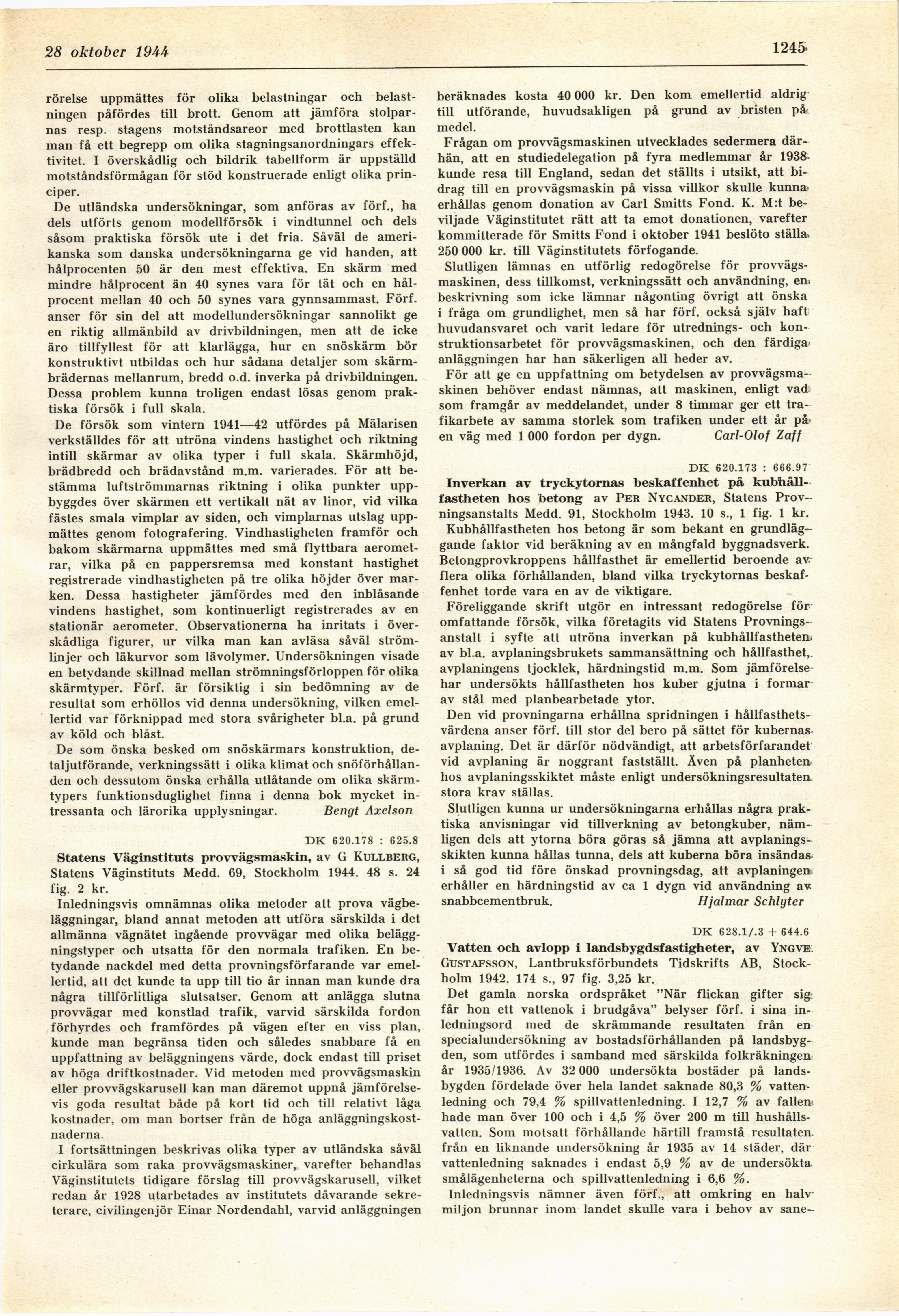 Full resolution (JPEG) - On this page / på denna sida - H. 43. 28 oktober 1944 - Några undersökningar av snöskärmar, av Bengt Axelson - Statens Väginstituts provvägsmaskin, av Carl-Olof Zaff - Inverkan av tryckytornas beskaffenhet på kubhållfastheten hos betong, av Hjalmar Schlyter - Vatten och avlopp i landsbygdsfastigheter, av Nils Sandin