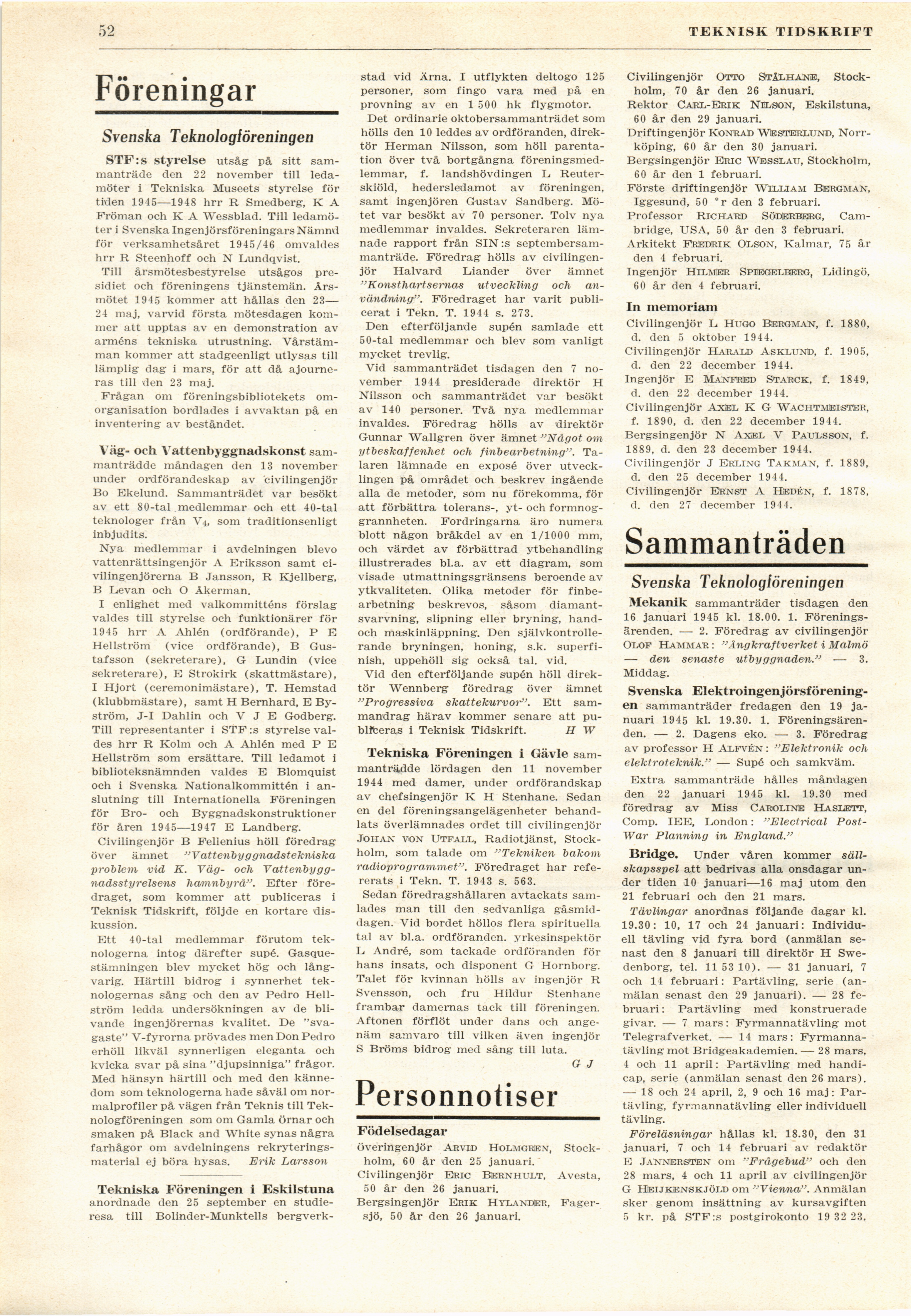 Full resolution (JPEG) - On this page / på denna sida - H. 2. 13 januari 1945 - Föreningar - Svenska Teknologföreningen. STF:s styrelse - Väg- och Vattenbyggnadskonst, av Erik Larsson - Tekniska Föreningen i Eskilstuna, av H W - Tekniska Föreningen i Gävle, av G J - Personnotiser - Sammanträden